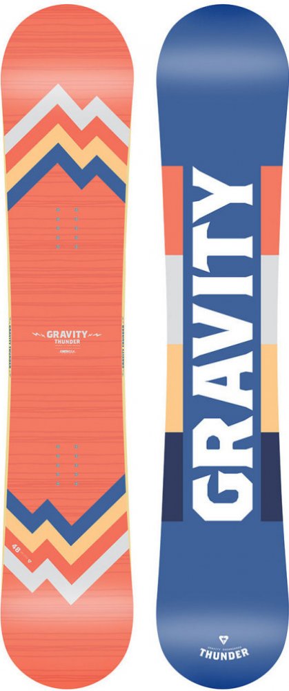 Parkový a freestyle dámský snowboard Gravity Thunder má hybridní prohnutí, které kombinuje to nejlepší z camberu a rockeru. Má měkký flex, takže se na něm dělají všechny možné triky, biaxiální laminát a dřevěné jádro zase zajišťují stabilitu, pevnost a nížkou hmotnost, a tudíž i dobrou ovladatelnost.