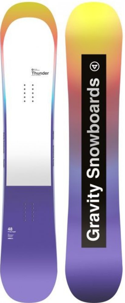 Freestylově zaměřený dámský a dívčí snowboard Gravity Thunder je hodně točivý díky cam-rock prohnutí, má pružné sidewally aby lépe odolával nárazům. Hodí se jak na upravenou sjezdovku tak na bedýnky a skokánky v parku. Pomůže zvládnout triky a skoky.