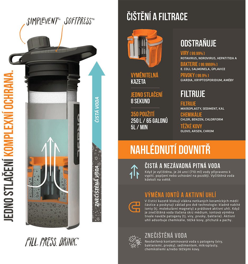 Vysoce účinný filtrační systém, s nímž získáte během pouhých 8 vteřin pitnou vodu vyčištěnou od patogenů (viry, bakterie, prvoci), chemikálií, těžkých kovů i pevných částic. Stačí jenom naplnit láhev vodou (z libovolného přírodního zdroje), stlačit jí a během chvilky máte vodu připravenou k pití. Postará se o to vyměnitelná filtrační kartuše uložená uvnitř láhve, která k odstranění kontaminantů vy...