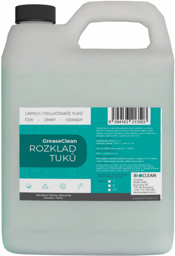 GreaseClean je biologický koncentrát vyvinutý pro účinný rozklad tuků v kuchyňských odpadech, odlučovačích tuků (LAPOL) a sběrných jímkách. Využívá vybrané mikroorganismy produkující enzymy a biosurfaktanty, které rozkládají tuky, škroby, bílkoviny a celulózu. Výsledkem je čistší odpadní potrubí, méně zápachu a snížení potřeby vývozů odlučovače tuků.