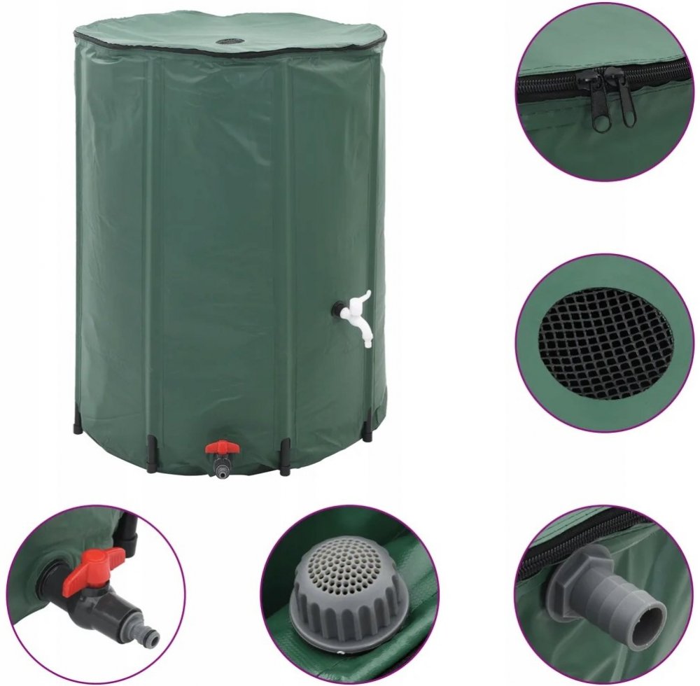 750 L skládací sběrač dešťové vody zachytává dešťovou vodu bez námahy a ukládá vodu v nádrži pro pozdější použití. Můžete použít nahromaděnou vodu na mytí vašeho auta, kola nebo domácích zvířat, atd. Díky vysoké kvalitní PVC, je odolný vůči UV záření a korozi, pro dlouhodobou životnost. Jelikož sběrač je vybaven filtry, nádrž čistí vodu uvnitř, takže můžete použít vodu jistější. Všechny potřebné příslušenství jsou baleny dohromady, včetně plachty z PVC, baterie s filtrem, přepouštěcí ventil, zahradní a odtokové hadice. Montáž je velmi jednoduchá. Získejte tuto ideální vodní nádrž od nás teď!