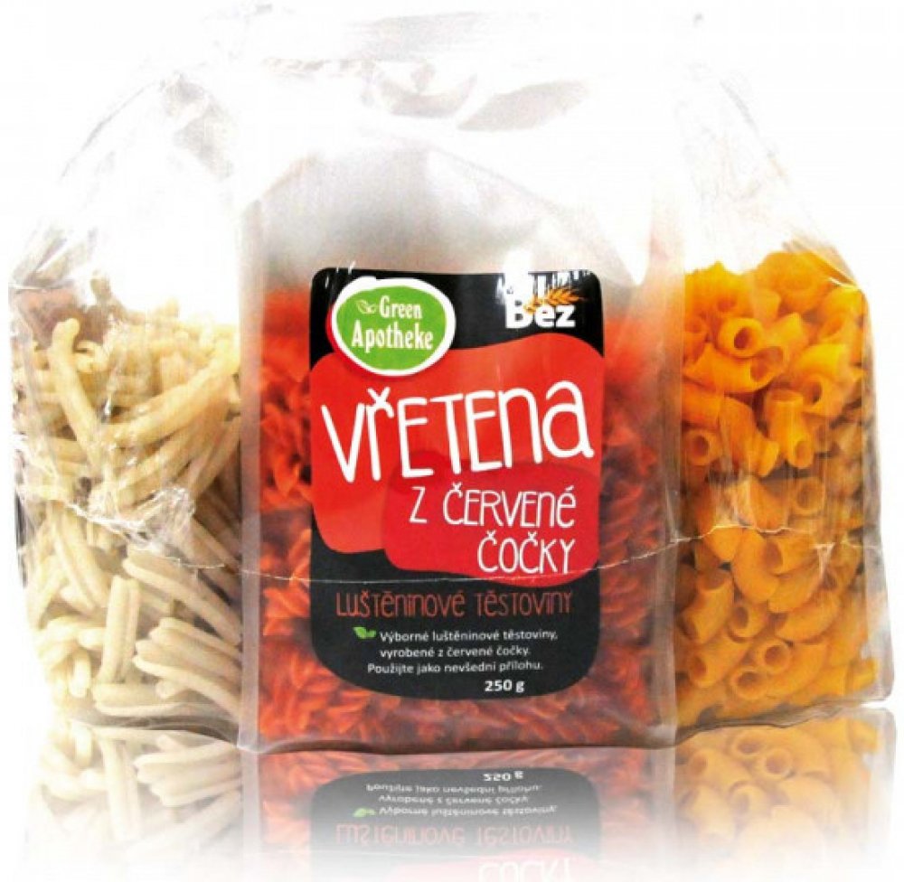 Green Apotheke Bezlepkové těstoviny 3 + 1 zdarma Výhodná sada bezlepkových těstovin z cizrny, hrachu, červené čočky, pohanky. Vřetena cizrnová 250 g Složení: Mouka z cizrny. Může obsahovat stopy soji. Výživové údaje v 100g výrobku: Energetická hodnota 1394kj/333kcal, tuky 4,7g, z toho nasycené mastné kyseliny 0,6g, sacharidy 54,3g, z toho cukry 3,7g, bílkoviny 21,8g, sůl 0,015g. Vřetena hrachová 250 g Složení: Hrachová mouka. Může obsahovat stopy soji. Výživové údaje v 100g výrobku: Energetická hodnota 1390kj/332kcal, tuky 1,4g, z toho nasycené mastné kyseliny 0,0g, sacharidy 56,7g, z toho cukry 3,2g, bílkoviny 23,1g, sůl 0,025g. Vřetena pohanková 250 g Složení: BIO pohanková mouka. Výživové údaje v 100g výrobku: Energetická hodnota 1512kj/356kcal, tuky 3,4g, z toho nasycené mastné kyseliny 0,7g, sacharidy 78,4g, z toho cukry 0,4g, bílkoviny 7,5g, sůl 0,25g. Vřetena z červené čočky 250 g Složení: Mouka z červené čočky. Může obsahovat stopy soji. Výživové údaje v 100g výrobku: Energetická hodnota 1477kj/353kcal, tuky 1,8g, z toho nasycené mastné kyseliny 0,4g, sacharidy 48,9g, z toho cukry 1,4g, vláknina 15,8g,bílkoviny 22,3g, sůl 0,25g. Výhodná sada bezlepkových těstovin z cizrny, hrachu, červené čočky, pohanky. Přílohové těstoviny si vychutnejte s tuňákem a zeleninou, budou výtečnou potravinou na váš stůl.