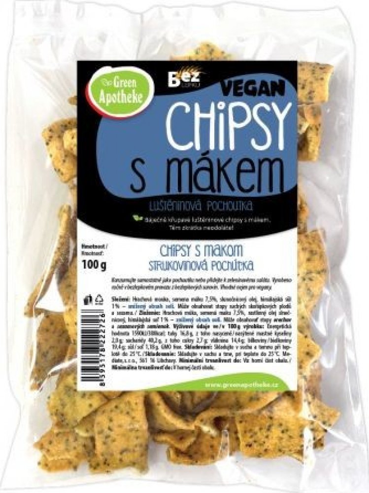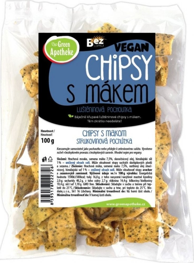 Green Apotheke Chipsy makové 100 g. Báječně křupavé luštěninové chipsy s mákem. Těm zkrátka neodoláte! Konzumujte samostatně jako pochoutku nebo přidejte k zeleninovému salátu. Vyrobeno ručně v bezlepkovém provozu z bezlepkových surovin. Vhodné nejen pro vegany. Složení: Hrachová mouka, semena máku 7,5 %, slunečnicový olej, himálajská sůl 1 %. Může obsahovat stopy suchých skořápkových plodů a sez...