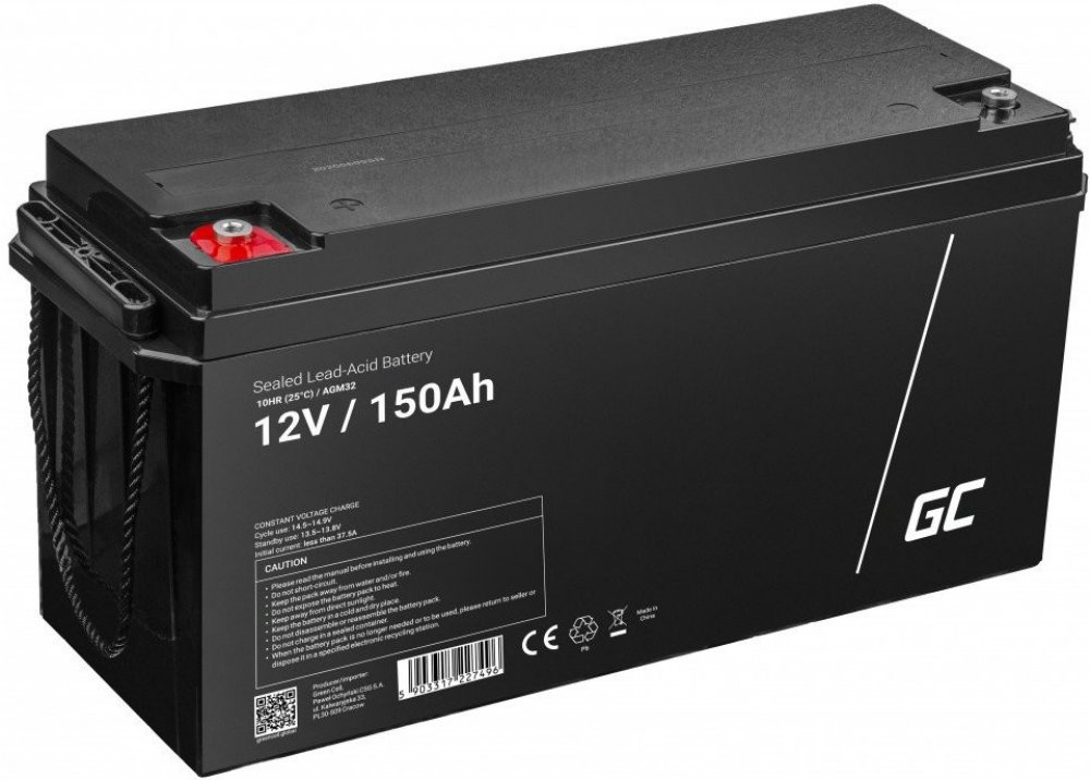 Baterie / akumulátor Green Cell AGM32 AGM VRLA Battery 12V 150Ah s dlouhou životností as kapacitou 12V je vyrobena z kvalitních materiálů, založená na technologií AGM tj konstrukce obsahující separátor ze skelné vaty, který absorbuje elektrolyt.
