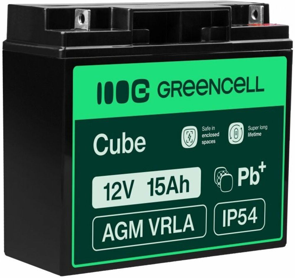Baterie olověná 12V 15Ah Green Cell Technologie AGM (absorbed glass mat) je technologie, při níž není v článcích mezi elektrodami elektrolyt v tekuté formě, ale je nasáklý v netkané tkanině ze skelných vláken (tzv. separátor, odděluje vzájemně kladné a záporné elektrody). Baterie postavené na této technologii jsou velmi výkonné, mají výborné nabíjecí charakteristiky, to znamená, že při vybití je m...