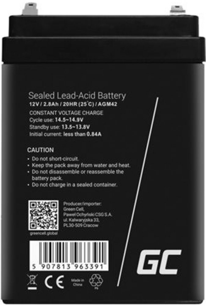 Baterie / akumulátor Green Cell AGM42 AGM Battery 12V 2.8Ah s kapacitou 12V je vyrobena z kvalitních materiálů, založená na technologií AGM tj konstrukce obsahující separátor ze skelné vaty, který absorbuje elektrolyt.