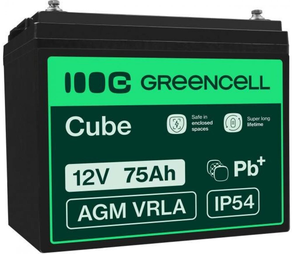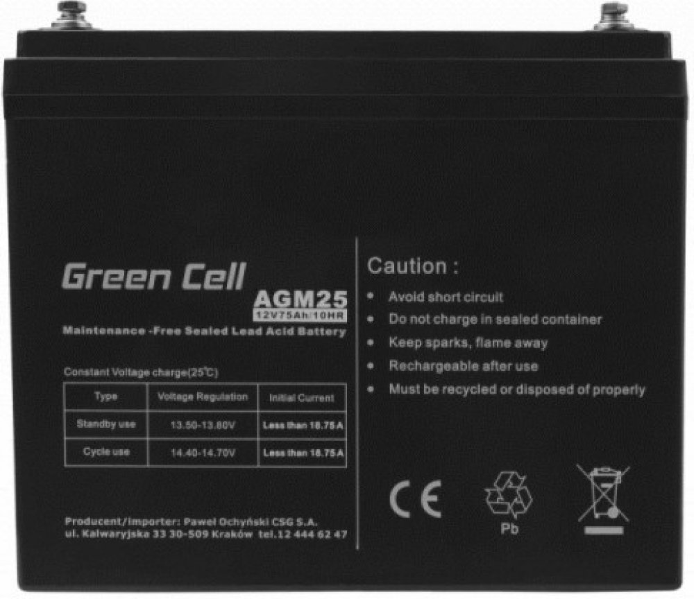 Baterie / akumulátor Green Cell AGM25 AGM Battery 12V 75Ah s kapacitou 12V je vyrobena z kvalitních materiálů, založená na technologií AGM tj konstrukce obsahující separátor ze skelné vaty, který absorbuje elektrolyt.