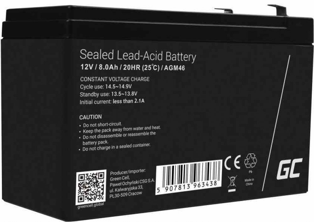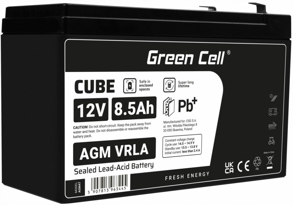 Baterie olověná 12V 8,5Ah Green Cell Technologie AGM (absorbed glass mat) je technologie, při níž není v článcích mezi elektrodami elektrolyt v tekuté formě, ale je nasáklý v netkané tkanině ze skelných vláken (tzv. separátor, odděluje vzájemně kladné a záporné elektrody). Baterie postavené na této technologii jsou velmi výkonné, mají výborné nabíjecí charakteristiky, to znamená, že při vybití je mnohem snazší a rychlejší je nabít a také jsou velmi dobře odolné proti cyklické zátěži (nabíjení a vybíjení). Baterie typu AGM jsou absolutně bezúdržbové, odolné proti vytečení elektrolytu a bezpečné. Použití: • Zabezpečovací systémy • Protipožární systémy • Havarijní napájecí zdroje UPS • Solární systémy • Telekomunikační zařízení • Kontrolní zařízení • Lékařské zařízení • Hračky TECHNICKÉ SPECIFIKACE: • Kapacita: 8,5Ah • Napětí: 12V • Typ Faston: 6,3mm • Samovybíjení: 2% během měsíce při 25 ° C • Kapacita v závislosti na teplotě: 40°C 102% |25°C 100% | 0°C 85% | -15°C 65% • Nabíjecí napětí: 14,4-14,9 V (-30 mV / ° C) • Ochrana proti hlubokému vybití: Ano • Ochrana proti přetížení: Ano • Rozměry: 151 x 65 x 101 mm • Hmotnost: 2,2 kg
