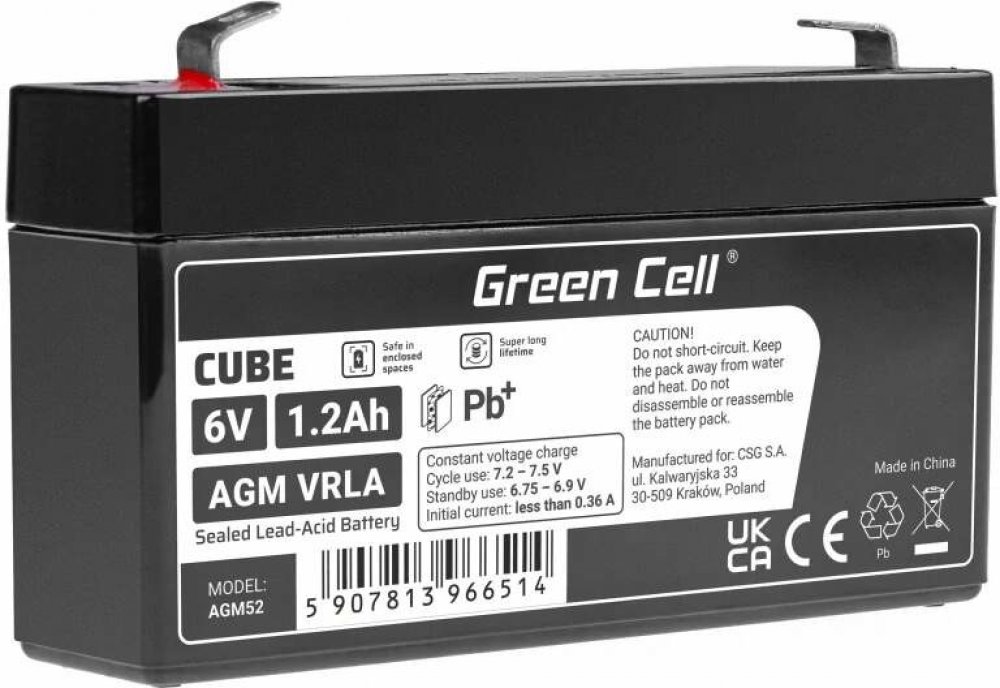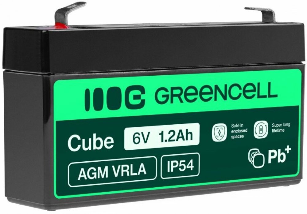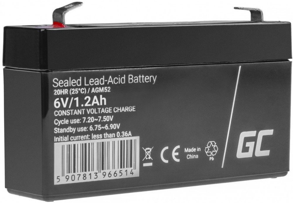 Bezúdržbová baterie / akumulátor Green Cell AGM52 AGM Battery Lead Acid 6V 1.2Ah s kapacitou 6V je vyrobena z kvalitních materiálů, založená na technologií AGM tj konstrukce obsahující separátor ze skelné vaty, který absorbuje elektrolyt.