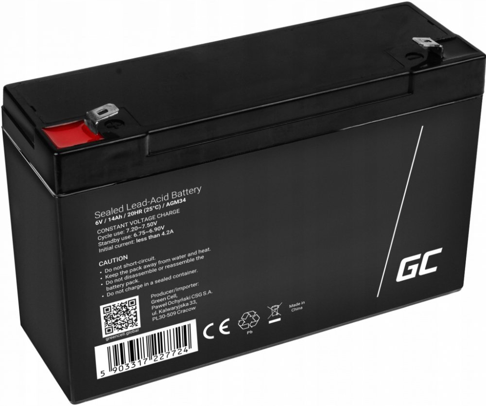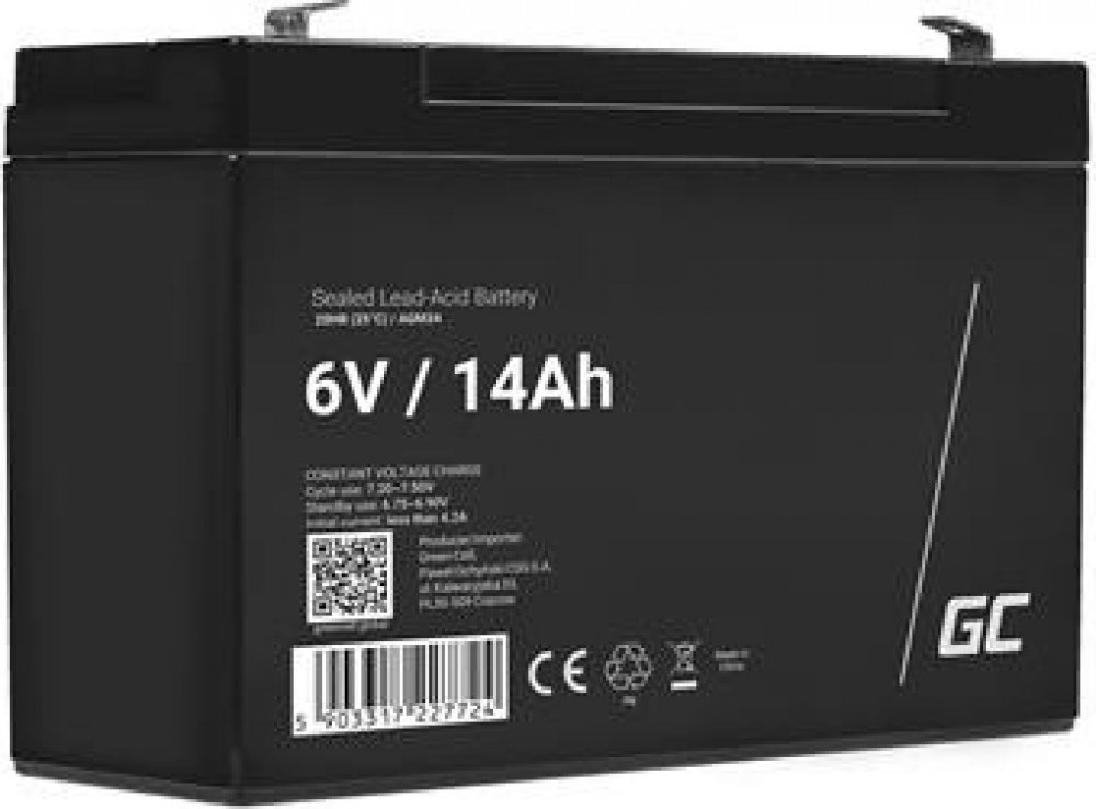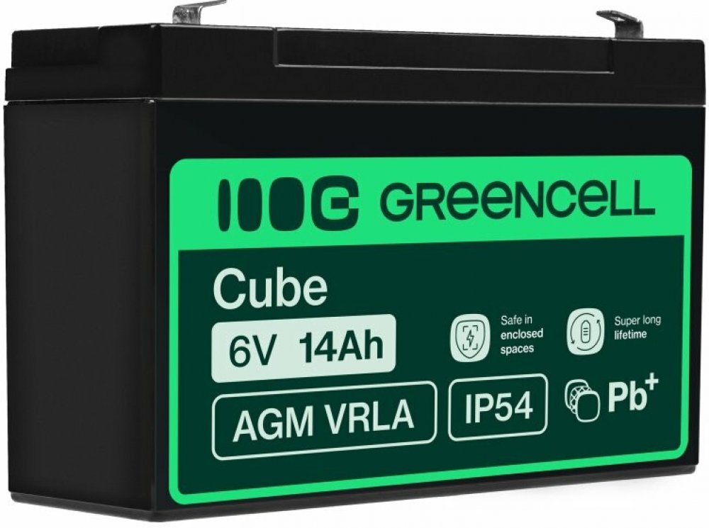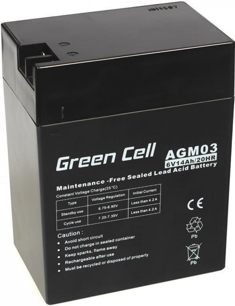Baterie / akumulátor Green Cell AGM34 AGM Battery 6V 14Ah s kapacitou 6V je vyrobena z kvalitních materiálů, založená na technologií AGM tj konstrukce obsahující separátor ze skelné vaty, který absorbuje elektrolyt.
