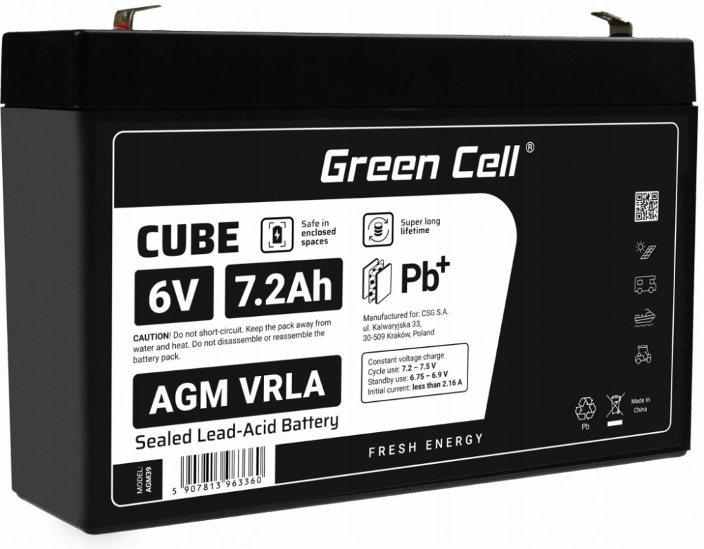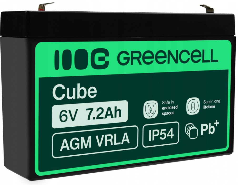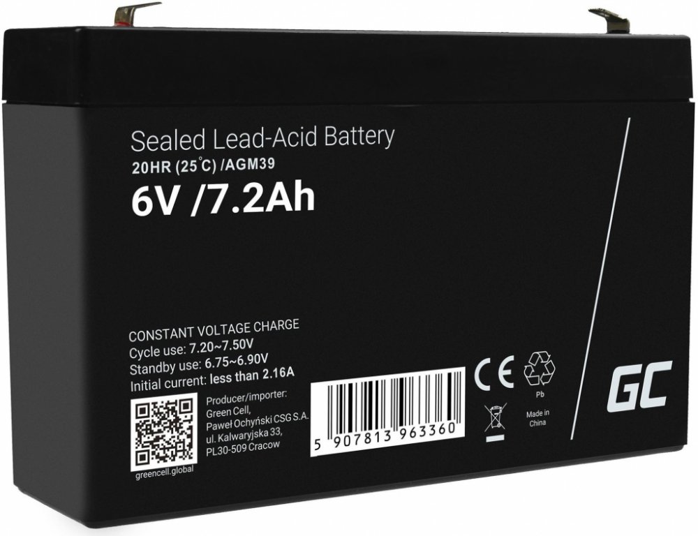 Baterie / akumulátor Green Cell AGM39 AGM VRLA Battery 6V 7.2Ah s dlouhou životností as kapacitou 6V je vyrobena z kvalitních materiálů, založená na technologií AGM tj konstrukce obsahující separátor ze skelné vaty, který absorbuje elektrolyt.