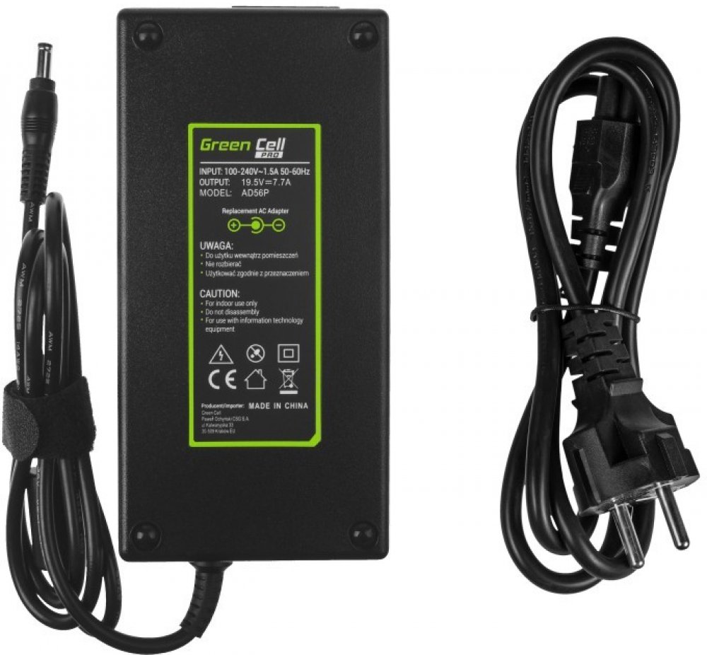 Napětí: 19.5VVýkon: 150WProud: 7.7ABarva: ČernáVýrobce: Green CellRozměr: 17 x 8,5 x 4,2 cmHmotnost: 700gPřiloženo: 1.2m napájecí šňůra, návod, záruční listTyp zásuvky: kruhové (5.5-2.5mm)Série: PROOchrana: tepelná, přepěťová, proti zkratuDélka kabelu: přes 2m