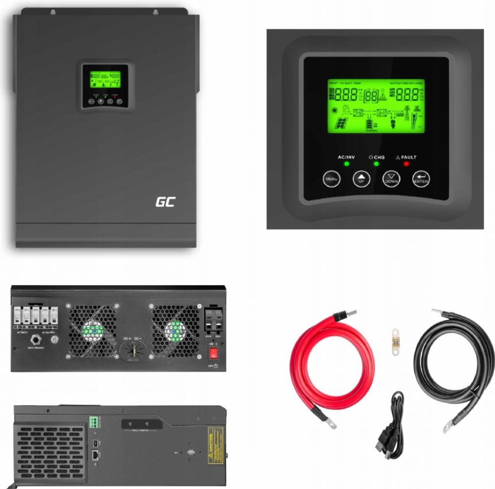 Rozměr: 297,5 X 468 X 125 mmHmotnost: 13.3kgVýstup Napětí: 230V ACVýstup frequency: 50Hz / 60HzCharakteristika výstupního napětí: Čistá sinusoidaÚčinnost: 98%Použitelný výkon (continuous): 3000WOkamžitý výkon (impulsive): 6000WPobór mocy (bez obciążenia): 2WBaterie voltage: 48VMaximum PV voltage (VOC): 145VDCMěnič efficiency: 90% - 93%AC voltage adjustment (battery mode): 220VAC - 240VAC (adjustab...