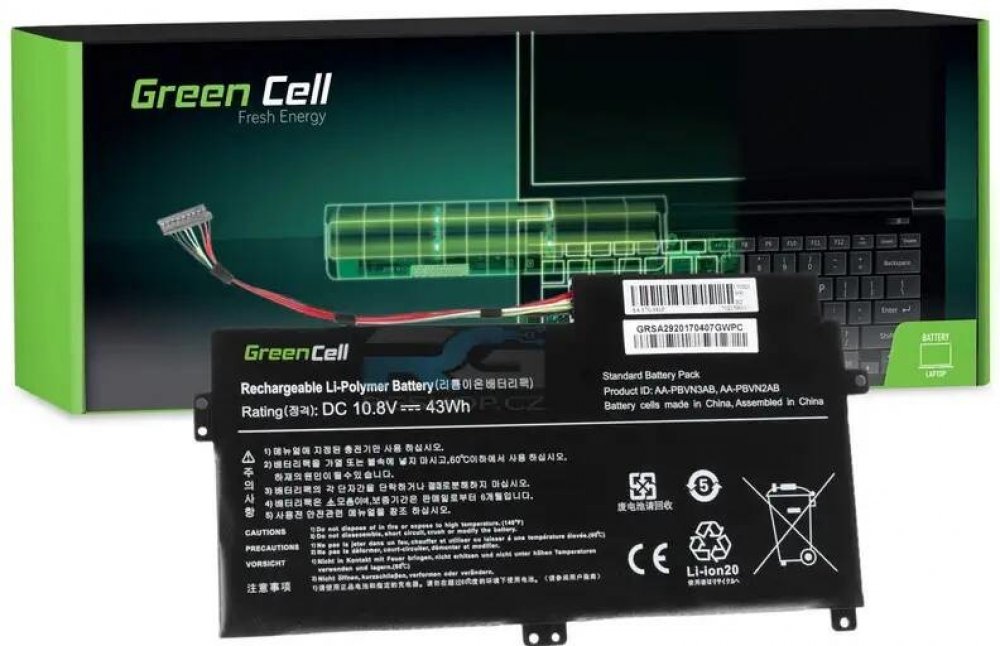 Baterie Green Cell si po roce používání udrží více než 80 % své kapacity. Osvědčené a kvalitní baterie pro notebooky Samsung 370R 370R5E 450R 450R5E 470RPoužité články a elektronika nejvyšší jakosti zaručí, že baterie spolupracuje s notebookem stejně jako originální baterieNejdůležitější vlastnosti:Lithium-polymerové články Green Cell – značkové články poskytují vysokou reálnou kapacitu 3400mAh (37Wh)Vysoká kapacita zaručí dlouhý provoz – od 1,5 do 6 hodin výdrže baterie , v závislosti na konfiguraci notebooku a provozním režimuPolymerové články Green Cell jsou odolné – až 1000 plných nabíjecích cyklůModerní řídicí elektronika zajišťuje, že baterie funguje stejně jako originální baterie Samsung AA-PBVN2AB, AA-PBVN3ABBaterie Green Cell si po roce používání udrží více než 80 % své kapacityGreen Cell je nejčastěji voleným výrobcem náhradních baterií notebooků. Tato značka zaručuje příznivý poměr ceny a kvality. Použité materiály včetně článků jsou stejně kvalitní jako originální baterie.Technické specifikace:Výrobce: Green CellTyp článku: Li-PolŽivotnost baterie: 1,5h až 6h výdrže baterieKapacita: 3400mAh (37Wh)Napětí: 10,8V (plně kompatibilní s 11,1V)Počet článků: 6Použité elektronické ochrany: přepětí, přehřátí, nadměrné vybití, přebitíCertifikáty: CE, RoHSStav: NováBarva: ČernáKód produktu: SA29