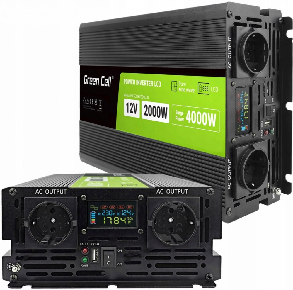 Green Cell PowerInverter LCD 12 V 2000W/40000W čistá sinusoida