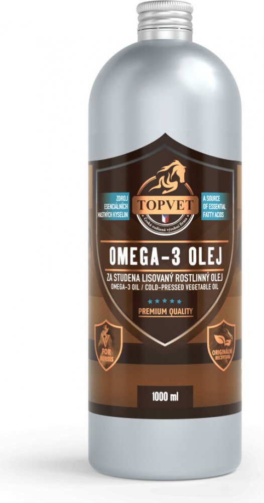 Omega 3 olej TOPVET je kvalitní přírodní doplněk stravy určený pro koně, který obsahuje vyváženou směs rostlinných olejů bohatých na nenasycené mastné kyseliny. Ty přispívají k optimální funkci kardiovaskulárního, nervového, respiračního a trávicího systému. Pravidelné používání oleje zlepšuje kvalitu kopyt, pokožky a srsti, zvyšuje odolnost organismu a podporuje vytrvalost a výkon zvířete. Olej m...