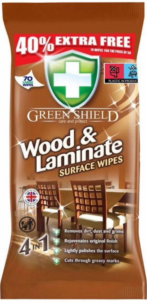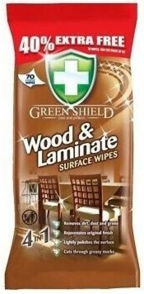 Vlhčené ubrousky GreenShield Wood+Laminate 70 ks, pro použití v domácnosti na dřevo a lamináty, odstraňují nečistoty, prach a mastnotu, leští povrch a obnovují jeho původní strukturu.