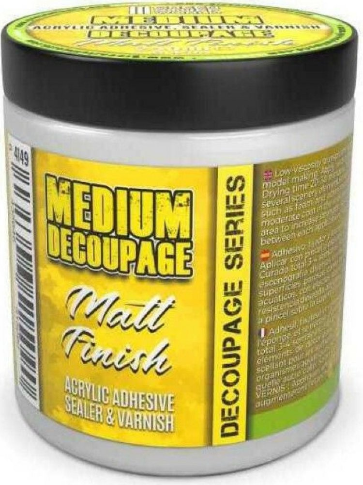Jedná se o matné nízkoviskózní transparentní schnoucí akrylátové lepidlo, tmel a lak s mnohostranným využitím v technice decoupage, řemeslné výrobě a modelářství. Nanáší se štětcem nebo houbičkou. Lze jej tónovat pigmenty, akrylovými tuši a barvami pro získání dalších povrchových úprav. Doba schnutí 20-30 minut. Celkové vytvrzení 3-4 týdny. Lze jej použít jako modelářské lepidlo na množství materiálů, jako jsou papírové vystřihovánky, látky, fotografie nebo několik scénických prvků v dioramatech, jako povrchový izolant s aplikací v puzzle a decoupage pracích a konečně jako tmel na porézní povrchy, jako je pěna a jiné strukturované prvky. Upozornění: Při uzavírání výrobků Medium Decoupe, které jsou zároveň lepidlem, se ujisti, že uzavírací plocha i uzávěr zůstávají beze zbytků výrobku. V opačném případě může dojít k přilepení uzávěru k hrdlu láhve, což může způsobit problémy při pokusu o její budoucí opětovné otevření.