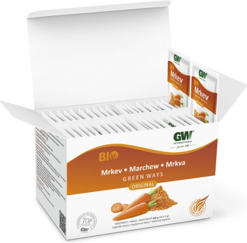 Mrkev Green Ways tvoří odšťavněná a následně vysušená šťáva z mrkve. Tuto šťávu sušíme při nízké teplotě (31 °C), díky čemuž v ní zůstává zachováno velké množství biologicky aktivních látek. Podobně jako další produkty Green Ways je i Mrkev Green Ways produktem ekologického zemědělství s bio certifikací.Hmotnost: 200 g (40 x 5 g). Baleno v ochranné atmosféře.Výživové údaje: Najdete v příbalovém letáku.Doporučené denní dávkování:Pro dospělé 1-2x denně (1 dávka = 5 g).Dětem od 3 let podávejte polovinu obsahu sáčku (2,5 g) 1-2 denně.Obsah sáčku rozmíchejte ve 200 ml vody.Upozornění:Není náhradou pestré stravy. Nepřekračujte doporučené denní dávkování.Výrobek není určen dětem do 3 let. Ukládejte mimo dosah dětí.Skladování: Uchovejte v suchu a temnu při teplotě do 30°C.Minimální trvanlivost do data uvedeného na zadní straně krabičky.Tento BIO produkt je kontrolován kontrolním orgánem pod kódem kontrolní organizace CZ-BIO-002