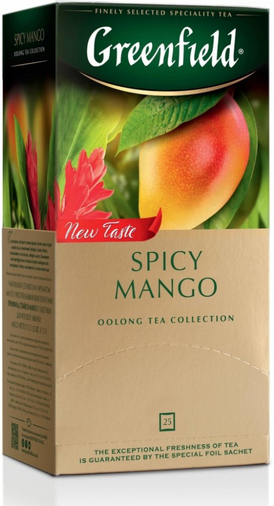 Greenfield Spicy Mango je originální čaj oolong s výrazným tropickým akcentem. Harmonické spojení jemné chuti polozeleného čínského čaje a šťavnatého exotického manga s lehkým kořeněným nádechem dělá z tohoto nápoje skutečný gurmánský zážitek. Čaj povzbuzuje, osvěžuje a hodí se jak pro ranní, tak odpolední chvíle.