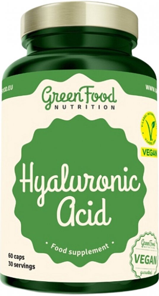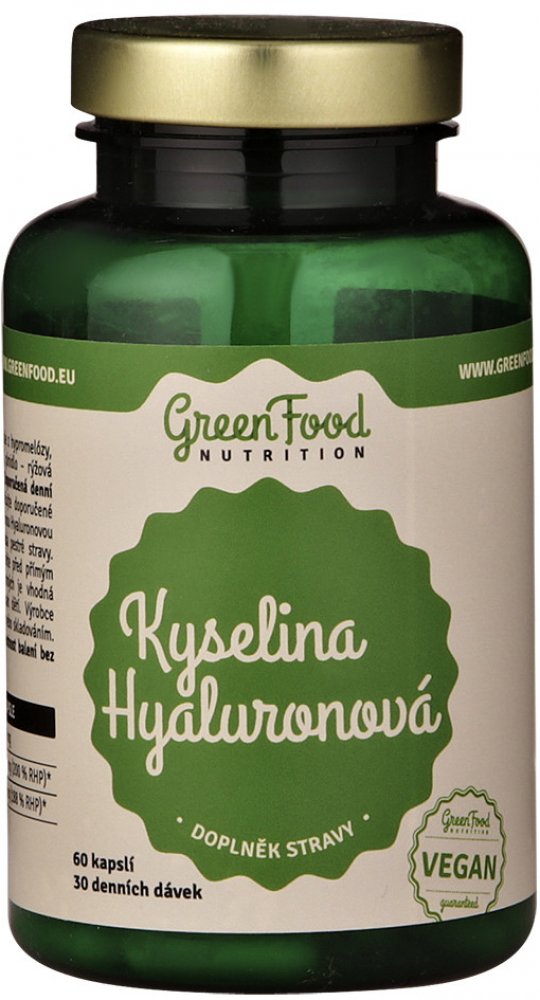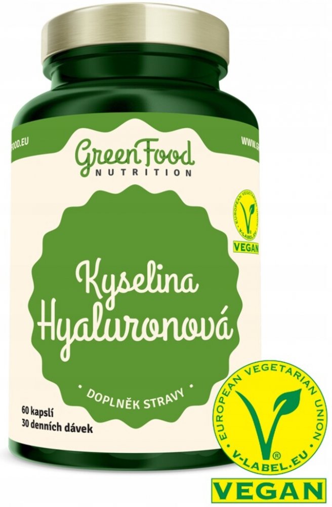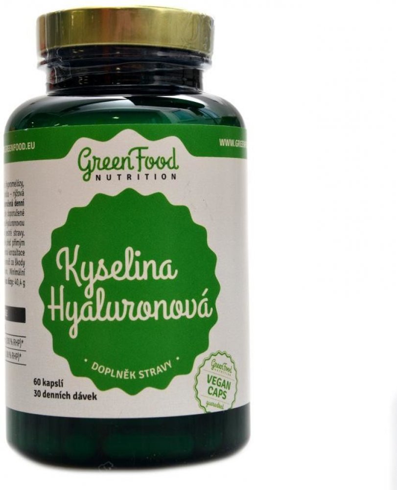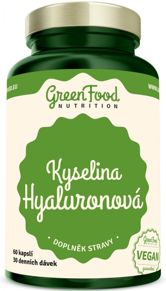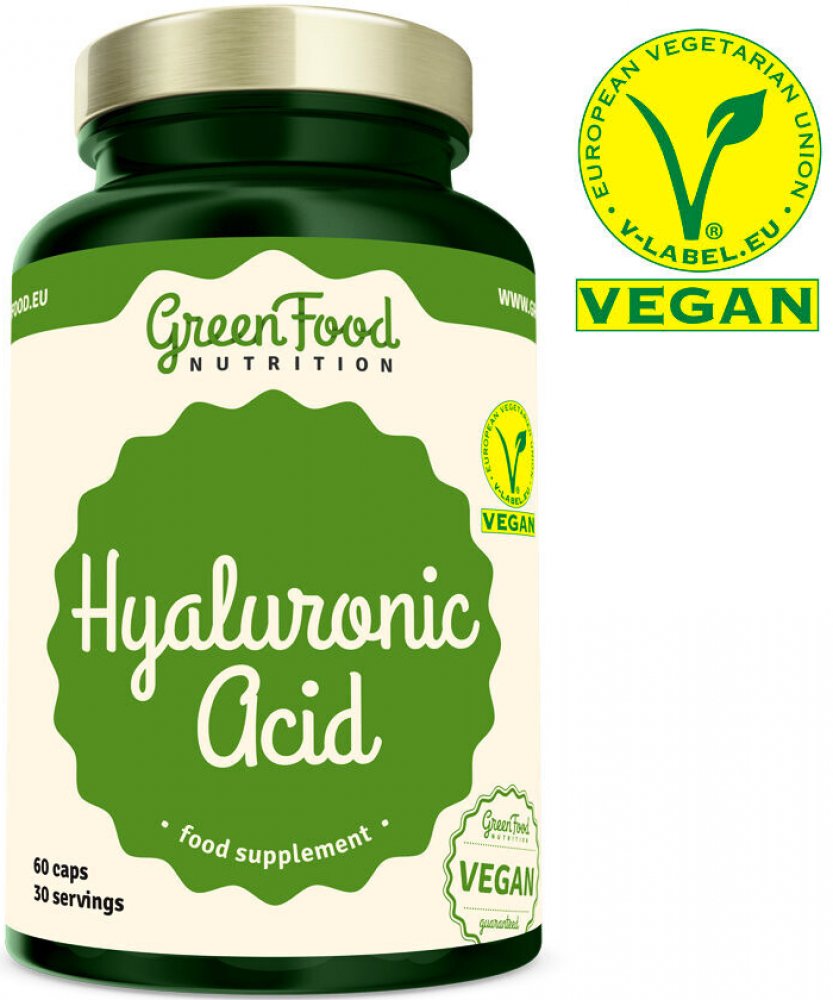 Kyselina hyaluronová je známá též jako hyaluronát sodný, je přirozenou součástí mezibuněčné hmoty, které vytváří naše buňky v našem těle. Spolu s kolagenem a elastinem je jednou z hlavních složek pojivové tkáně, která obklopuje naše kožní buňky, kde zajišťuje hydrataci a pevnost pleti. Mladá, zdravá pleť obsahuje velké množství kyseliny hyaluronové, ale s rostoucím věkem její produkce v pleti klesá a snižují se její stávající zásoby.Pro doplňky stravy, pro vnitřním užití, je doporučována středněmolekulární až vysokomolekulární kyselina hyaluronová. Nízkomolekulární formy nejsou pro vnitřním užití samy o sobě vhodné, užívají se pro vnějším použití v dermatologii, např. ve formě krémů, protože mají lepší prostupnost kožní bariérou.GreenFood Nutrition Kyselina hyaluronová se vyrábí fermentací určitého druhu bakterií, k výrobě nejsou používány látky živočišného původu. Je tedy vhodná i pro vegany. Použitá surovina se řadí mezi vysokomolekulární formy Kyseliny hyaluronové.