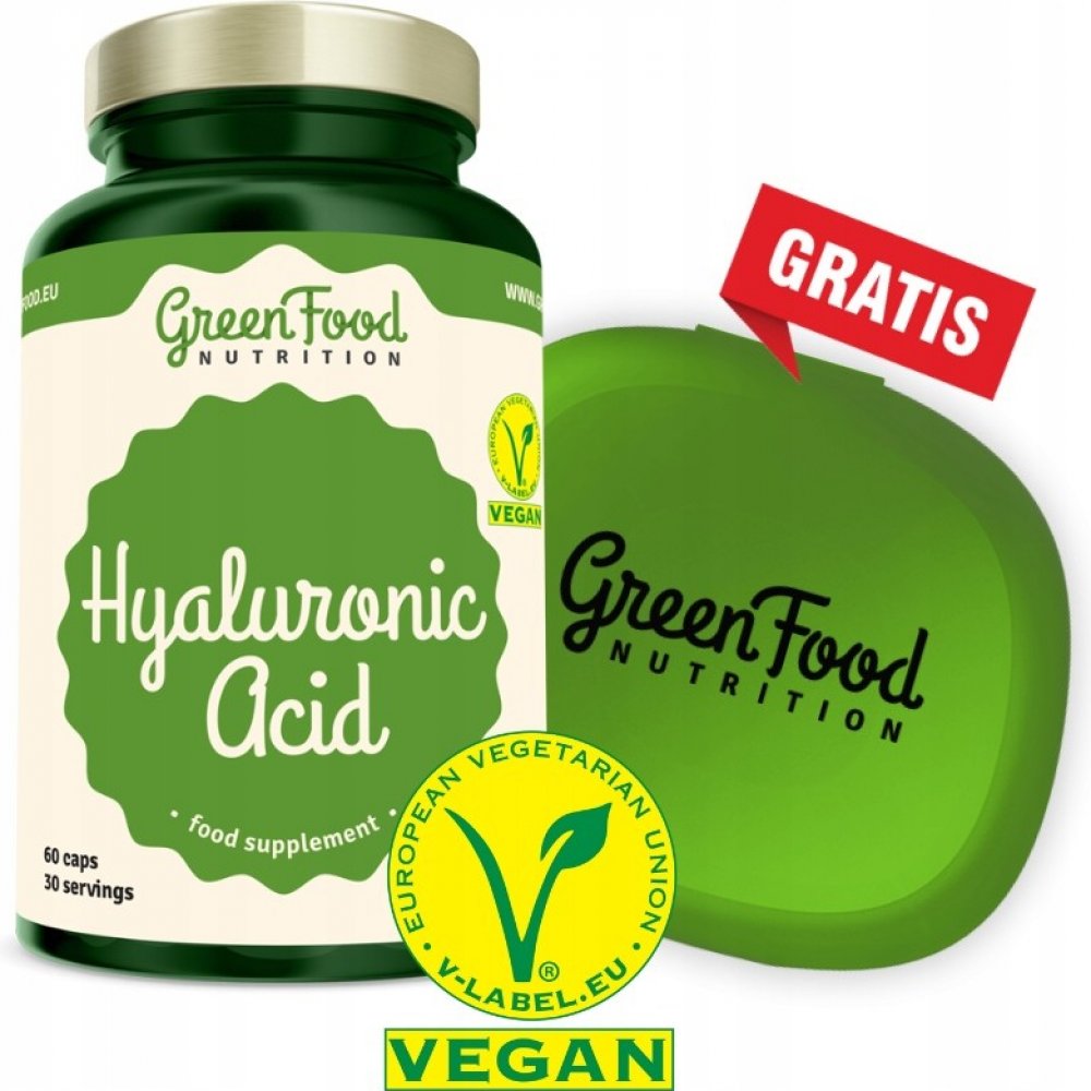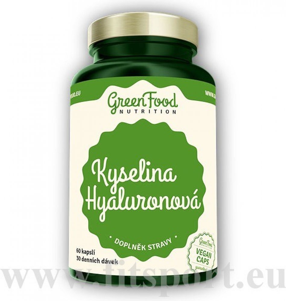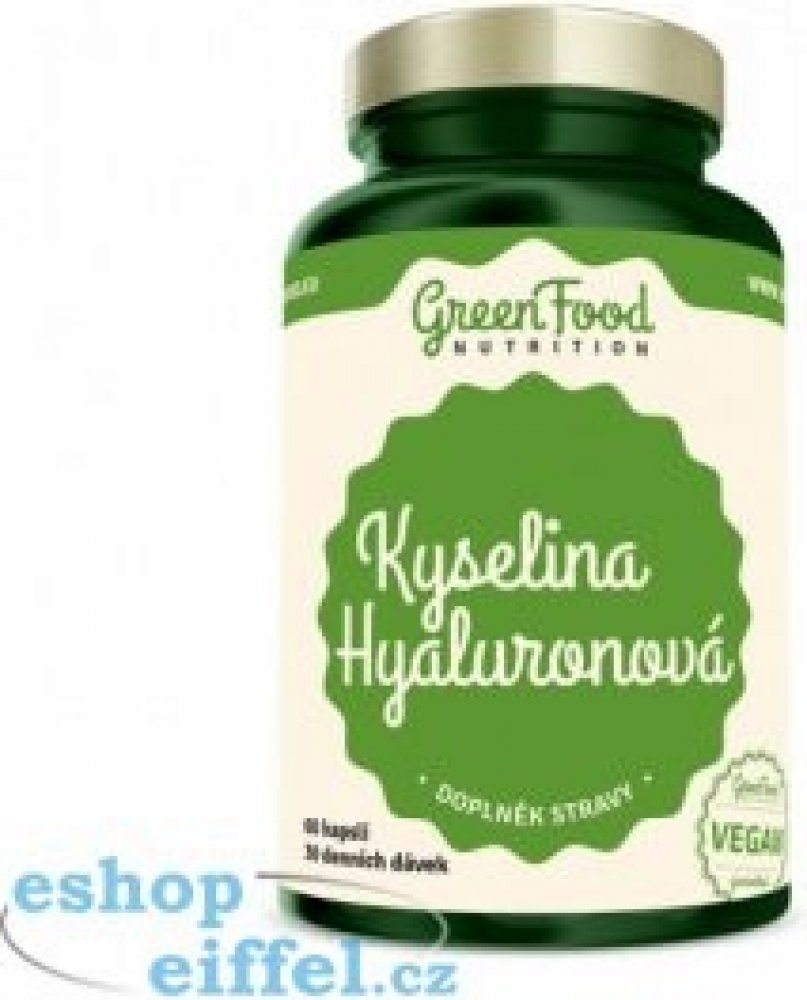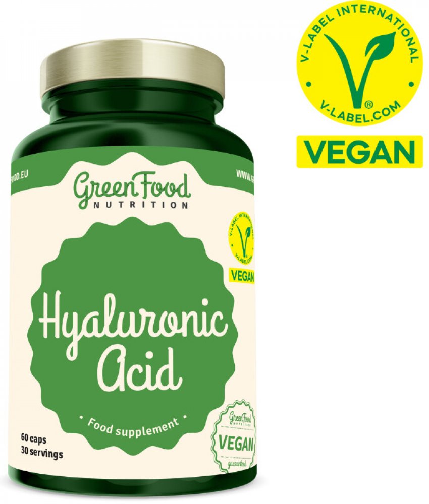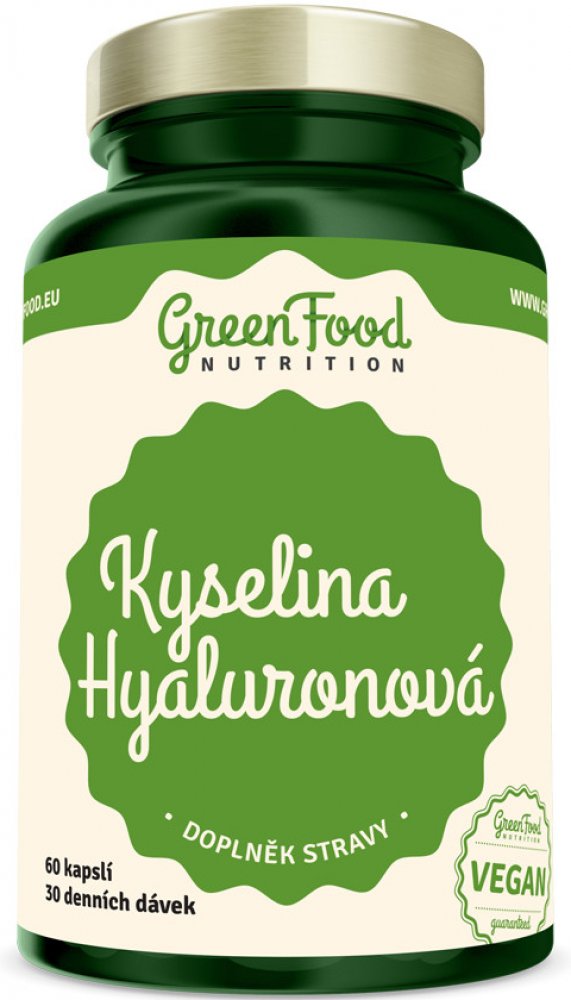 Kyselina hyaluronová je známá též jako hyaluronát sodný, je přirozenou součástí mezibuněčné hmoty, které vytváří naše buňky v našem těle. Spolu s kolagenem a elastinem je jednou z hlavních složek pojivové tkáně, která obklopuje naše kožní buňky, kde zajišťuje hydrataci a pevnost pleti. Mladá, zdravá pleť obsahuje velké množství kyseliny hyaluronové, ale s rostoucím věkem její produkce v pleti klesá a snižují se její stávající zásoby.Pro doplňky stravy, pro vnitřním užití, je doporučována středněmolekulární až vysokomolekulární kyselina hyaluronová. Nízkomolekulární formy nejsou pro vnitřním užití samy o sobě vhodné, užívají se pro vnějším použití v dermatologii, např. ve formě krémů, protože mají lepší prostupnost kožní bariérou.GreenFood Nutrition Kyselina hyaluronová se vyrábí fermentací určitého druhu bakterií, k výrobě nejsou používány látky živočišného původu. Je tedy vhodná i pro vegany. Použitá surovina se řadí mezi vysokomolekulární formy Kyseliny hyaluronové.