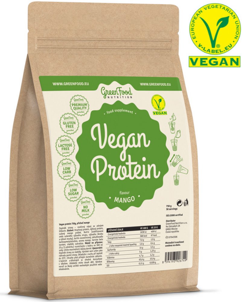 Složení příchuť Mango: Hrachový protein, dýňový protein, sušený mango prášek, Nutriz (stabilizovaná směs sušeného rýžového sirupu, rýžového škrobu a rýžové mouky), lecitin slunečnicový, zahušťovadlo karboxymetylcelulóza, aroma mango, barvivo beta karoten, sladidlo sukralóza.