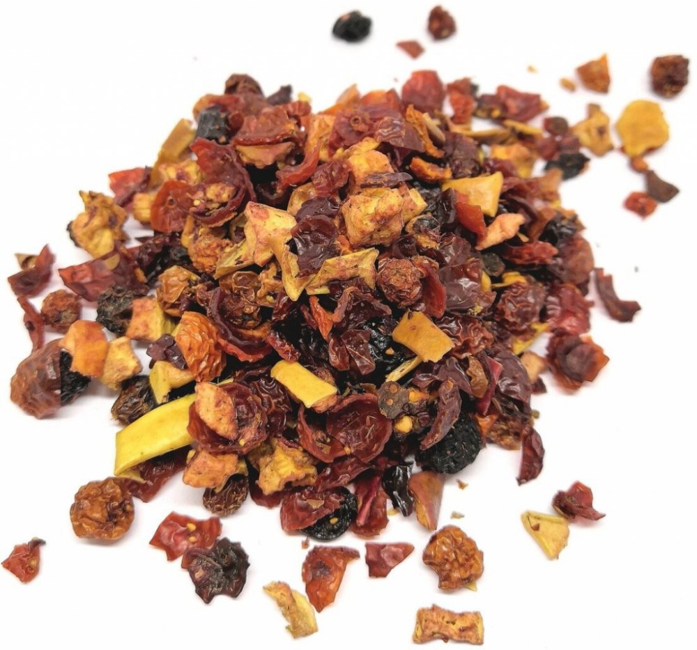 Čistě ovocný čaj bez ibišku osloví především milovníky jemných ovocných čajů bez kyselé příchuti. V chuti a vůni dominují višně a dozrálá jablíčka. Čaj chutná teplý i studený.Složení: šípek, jeřáb červený plod, aronie plod, jablka 13 %, černý rybíz plod, višeň plod 3 %, mrazem sušené jahody, hrušky, mrazem sušené meruňky, přírodní aroma