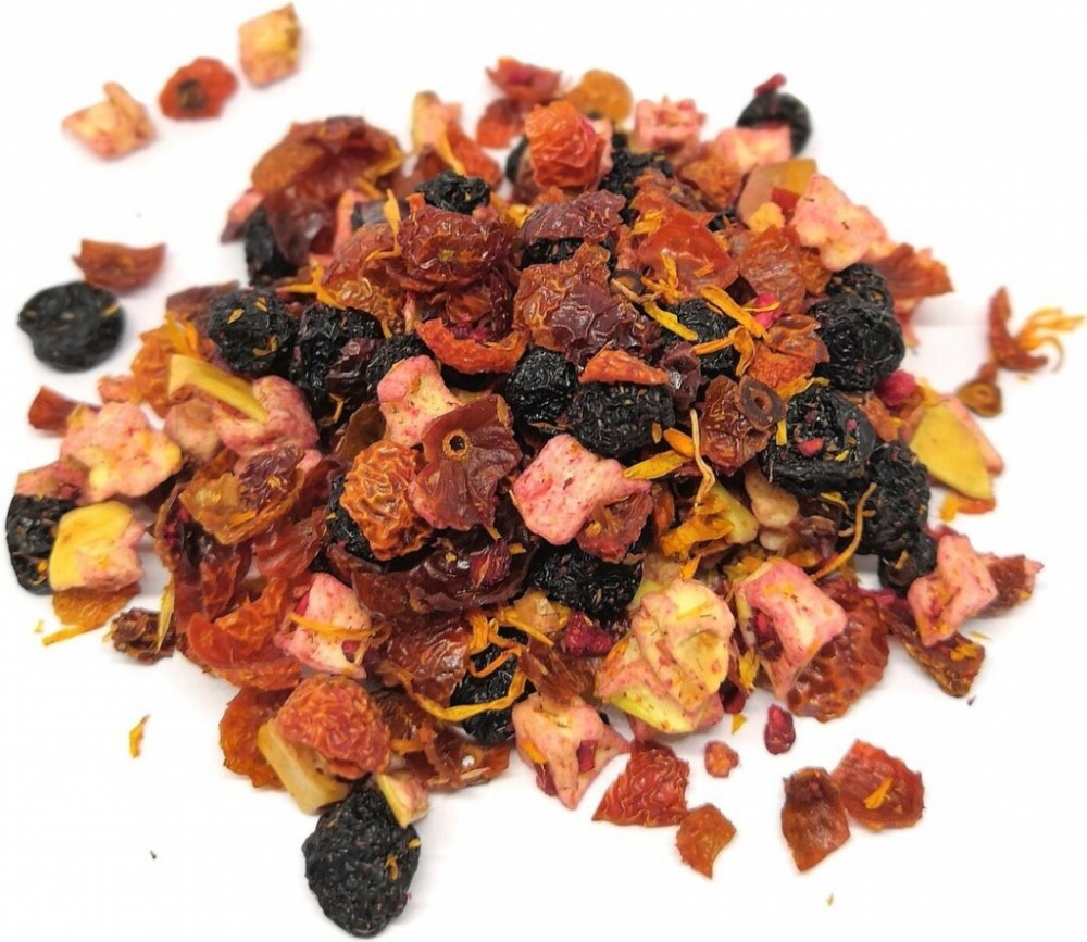 Jemná vůně a mírně navinulá, osvěžující chuť s výrazným akcentem černého rybízu a jablek. Čaj má světlou barvu - neobsahuje ibišek. Chutná teplý i studený.Složení: šípek, aronie plod, jablka 15 %, meruňky, černý rybíz plod 9 %, mrazem sušené maliny, měsíček květ, přírodní aroma