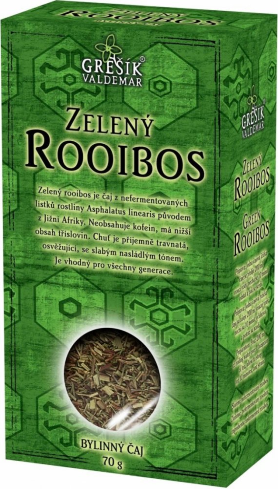 Zelený rooibos je čaj z nefermentovaných lístků rostliny Asphalatus linearis původem z Jižní Afriky. Neobsahuje kofein, má nižší obsah tříslovin. Chuť je příjemně travnatá, osvěžující, se slabým nasládlým tónem. Čaj je vhodný pro všechny generace.