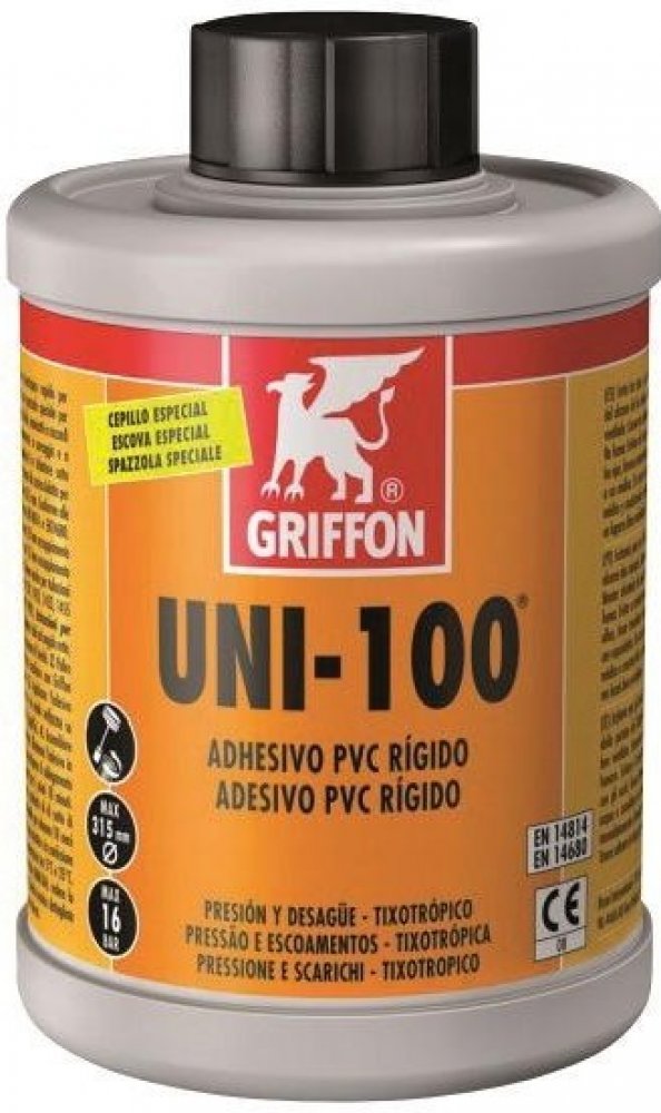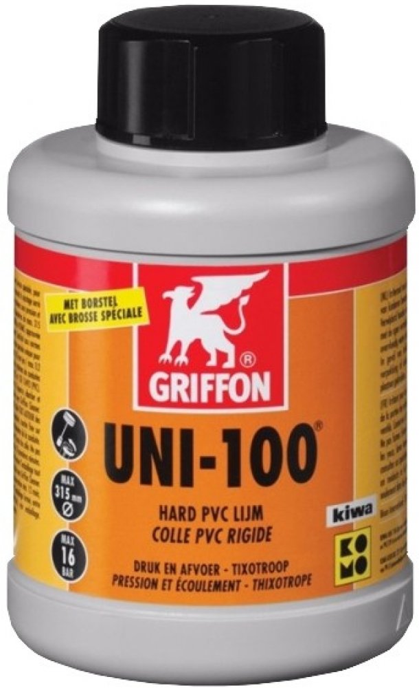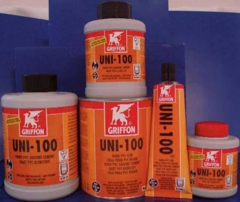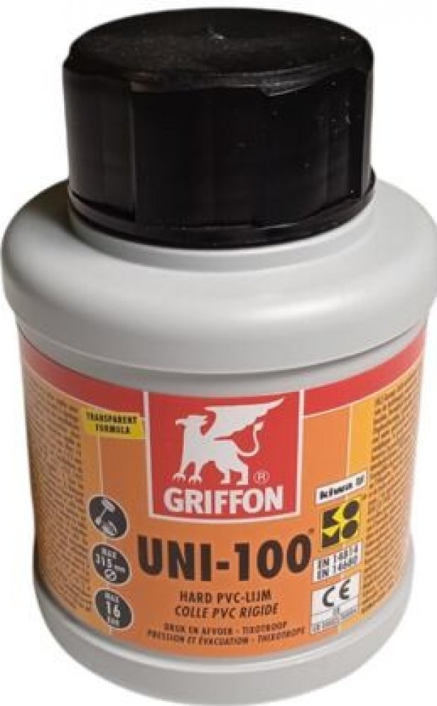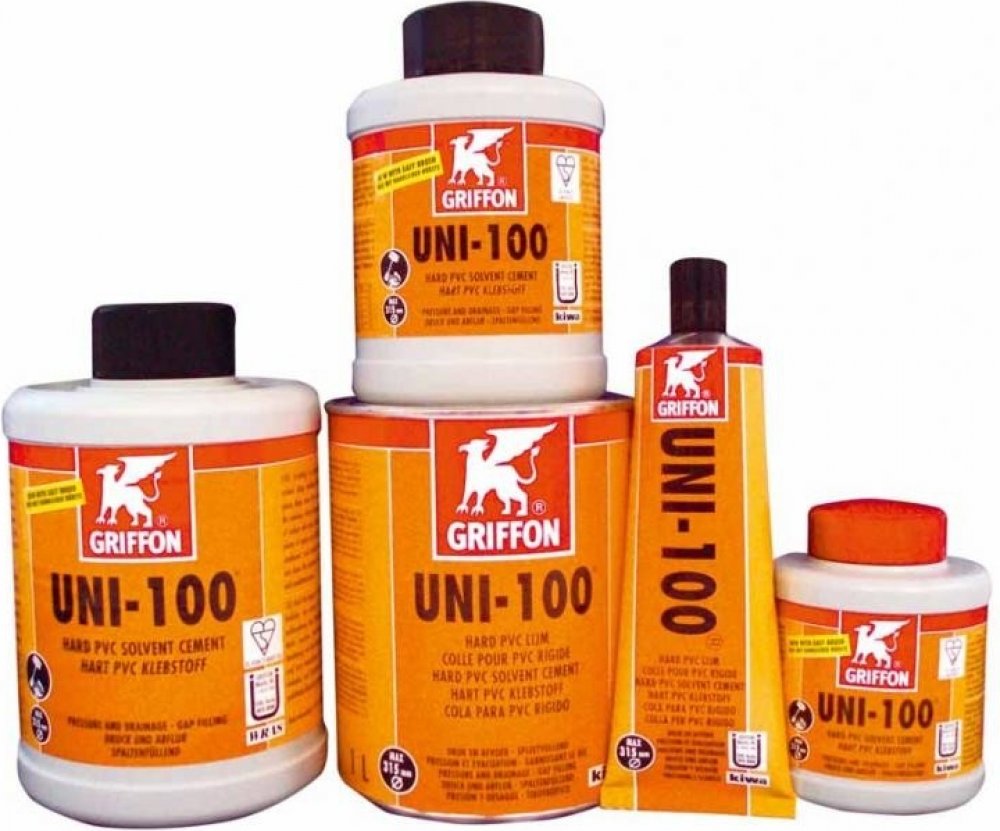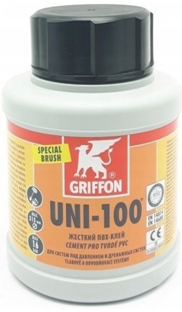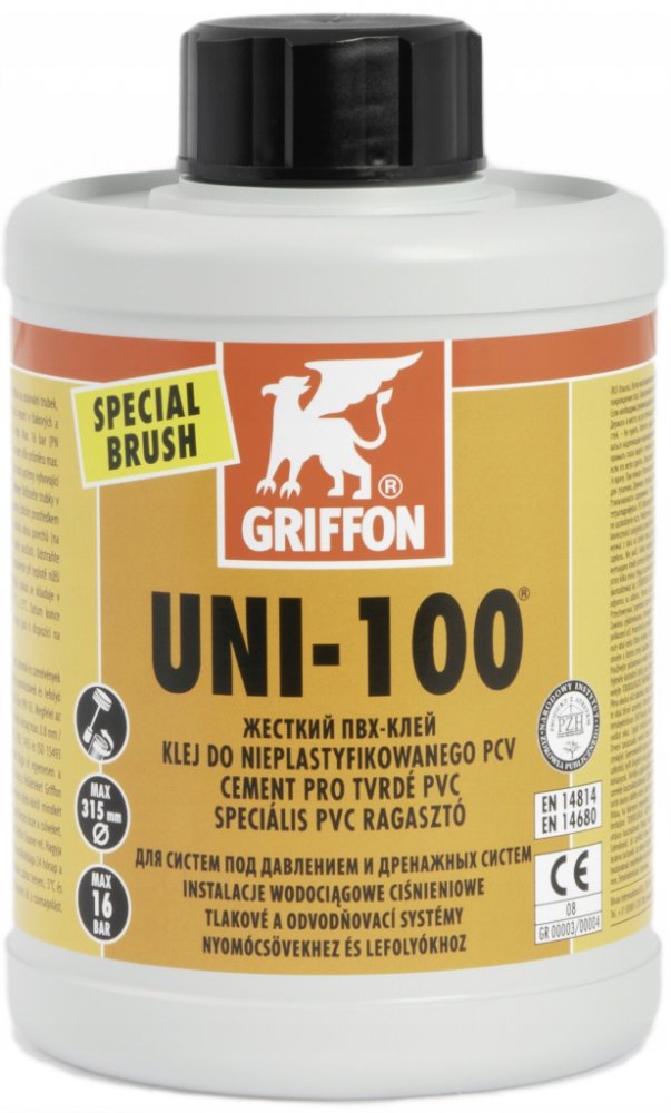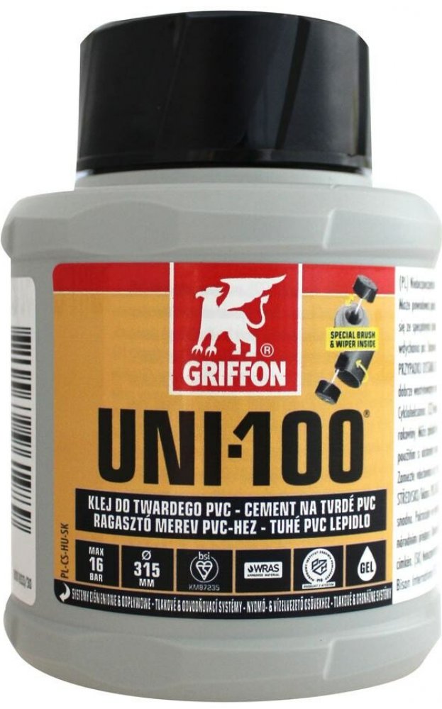 Lepidlo Griffon před použitím dobře potřepejte. Na obě očištěné a suché plochy štětcem naneste v podélném směru souvislou a rovnoměrnou vrstvu lepidla (u hrdla tenčí a u konce trubky hrubší). Trubky a fitink zasuňte až na doraz tak, abyste nepootočili lepené díly a několik vteřin podržte. Lepené díly musí být zasunuté do 4 minut od začátku nanášení lepidla. Teplota nad +25°C nebo tenčí vrstva lepidla způsobuje zkrácení otevřené doby zpracování. Skladujte lepidlo v teplotách Od 5°C do 25°C.