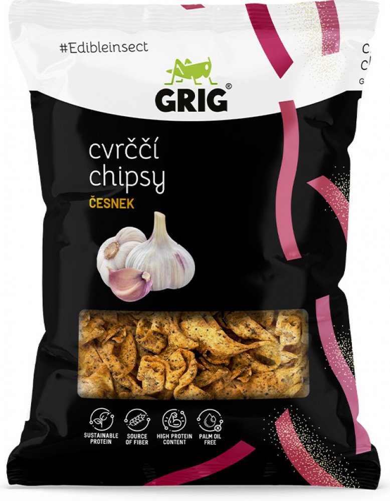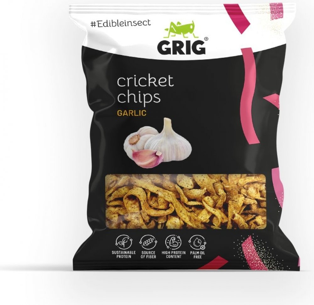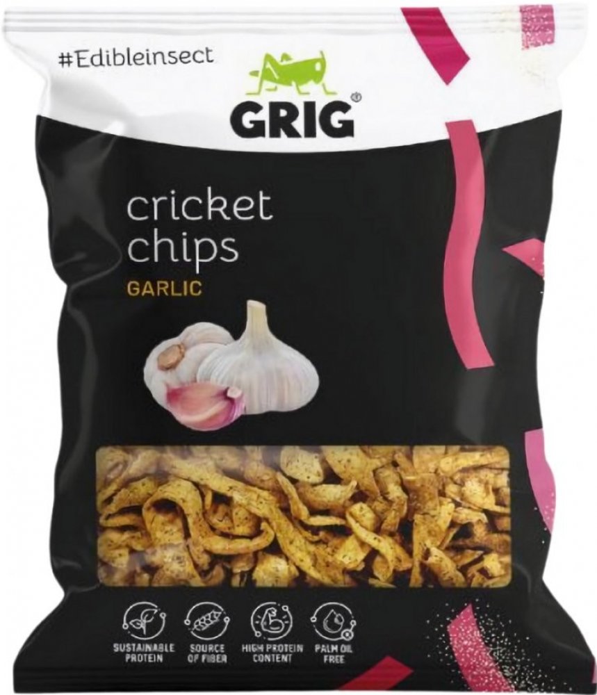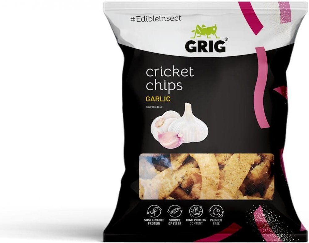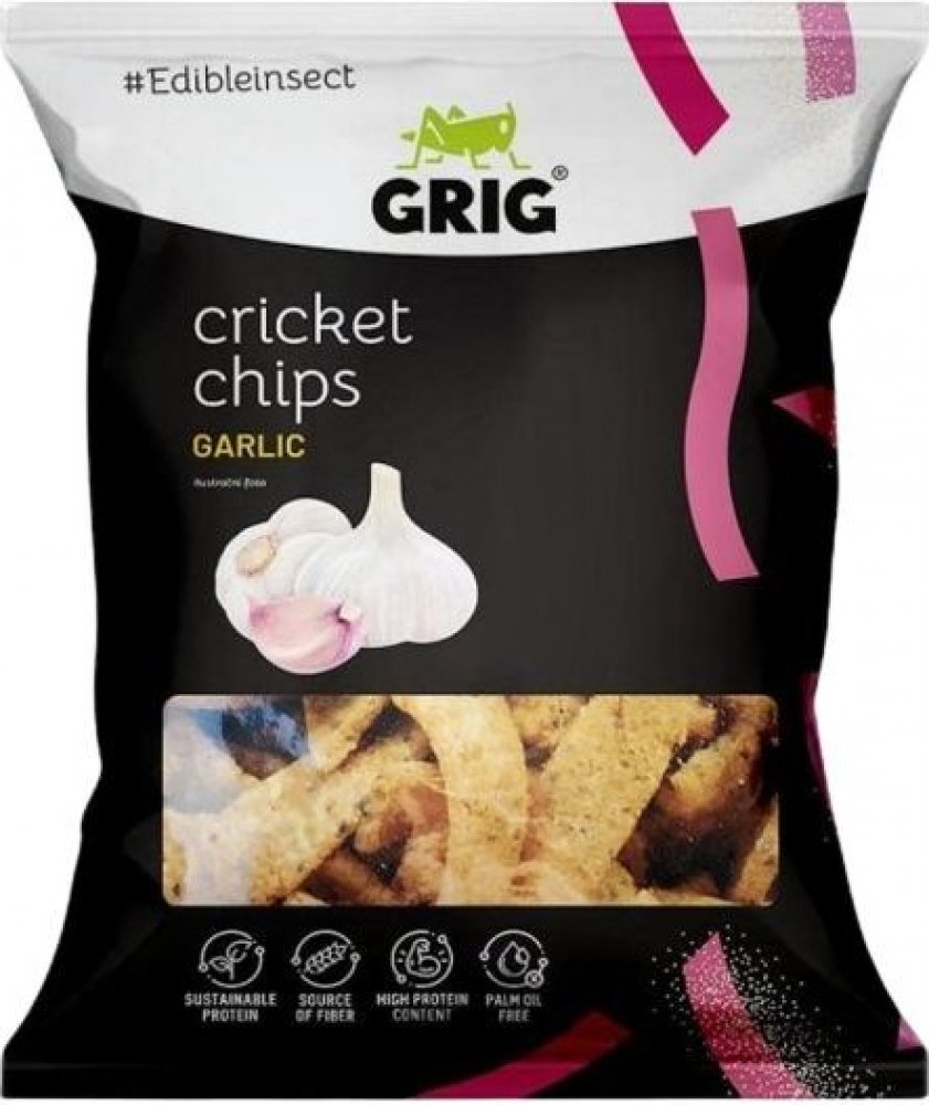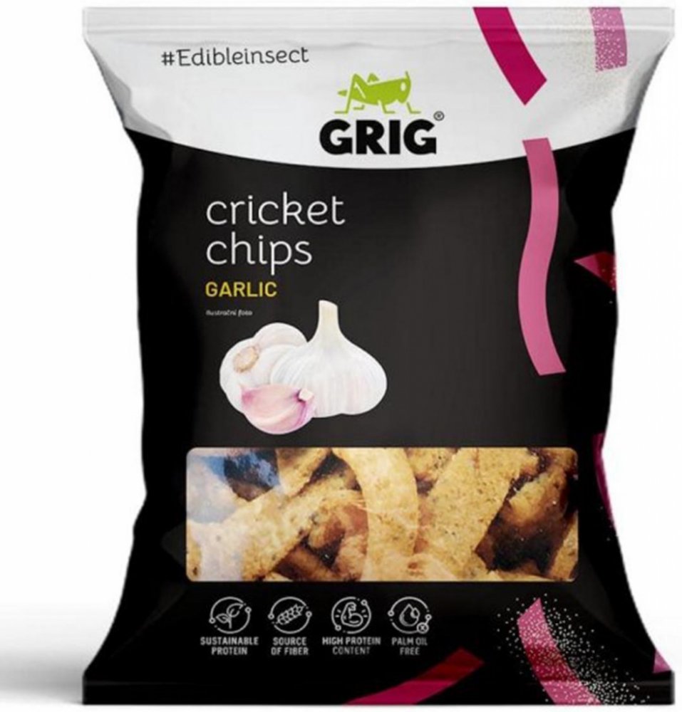 Hrachová mouka 61 %, čočková mouka 10 %, koření česnek 8,4 % [sušená zelenina 81 % (česnek 75 %, cibule), kvasničný extrakt, koření, extrakty koření], cvrččí prášek 7 % (Acheta domesticus), mák, dýňová mouka, bramborový škrob, jedlá sůl, řepkový olej. Může obsahovat stopy obilovin obsahujících lepek, celeru a arašídů. Konzumace cvrččího prášku (chitin) může lidem alergickým na měkkýše, korýše a roztoče vyvolat alergickou reakci.