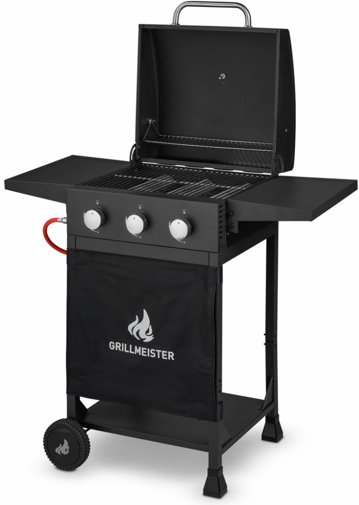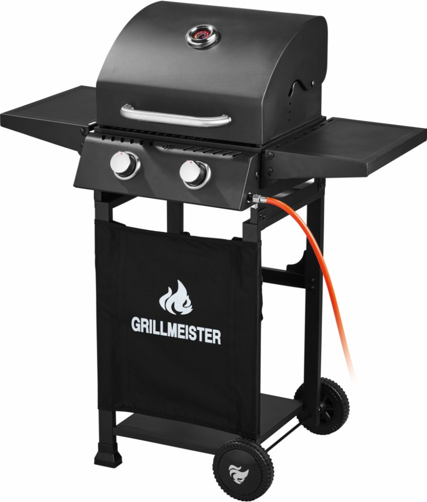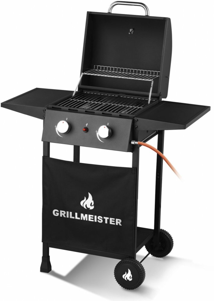 GRILLMEISTER Plynový gril se 2 hořáky 2 samostatně regulovatelné vysoce výkonné hořáky z ušlechtilé oceli (2x 3,0 kW) Rošt na udržení tepla – vhodný také na vaření při nízkých teplotách Spolehlivé zapínání díky piezo zapalovacímu systému Víko s držadlem z ušlechtilé oceli a integrovaným teploměrem Včetně přívodní hadice na plynovou lahev a regulátoru tlaku Podstavec s textilní clonou 2 boční odklá...