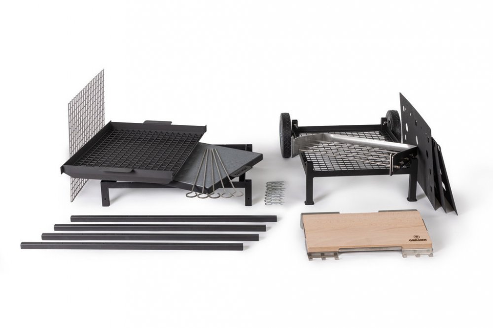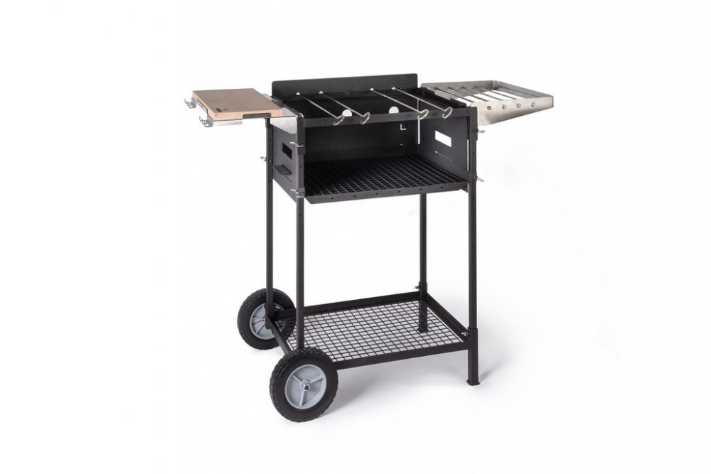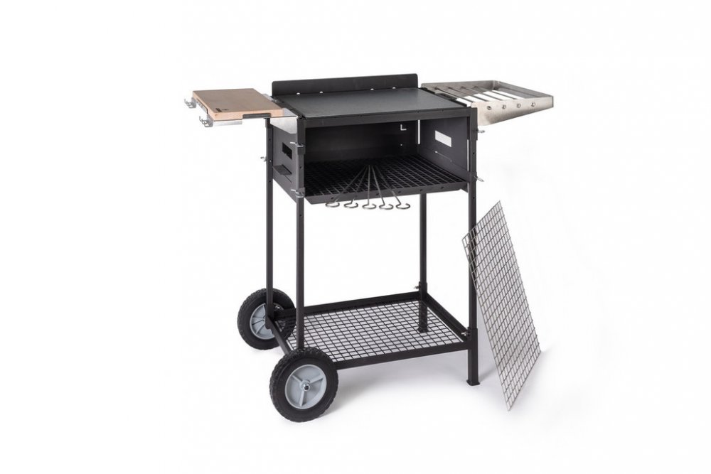 Sestava dále zahrnuje podvozek se dvěma bytelnými koly o průměru 20 cm, takže se s grilem můžete odvážit i do složitějšího terénu beze strachu z toho že se vám kola někde zadrhnou. Spodek podvozku je vyplněn drátěnou mřížkou, čímž je vytvořen úložny prostor pro palivo nebo jiné objemnější věci. Podvozek je v této variantě grilu vyroben z konstrukční oceli a lakovaný žáruvzdornou barvou. Gril se jednoduše postaví do průvlaků v podvozku a nohy se zajistí křídlatými šrouby. Celý gril je díky podvozku pevnější a stabilnější a grilovací plocha se zvýší na výšku 85 cm, což představuje naprostý komfort a grilování bez ohýbání zad.