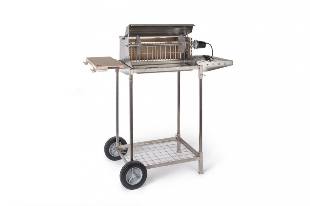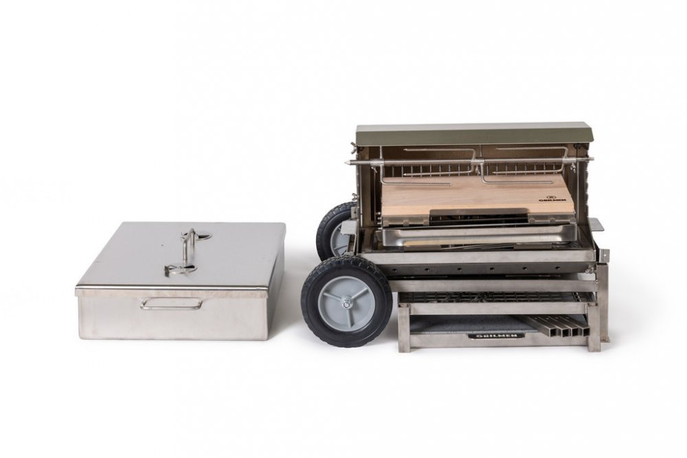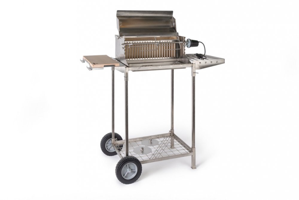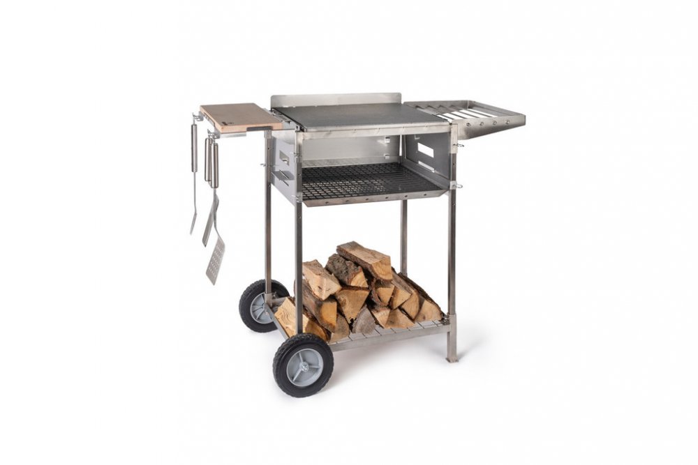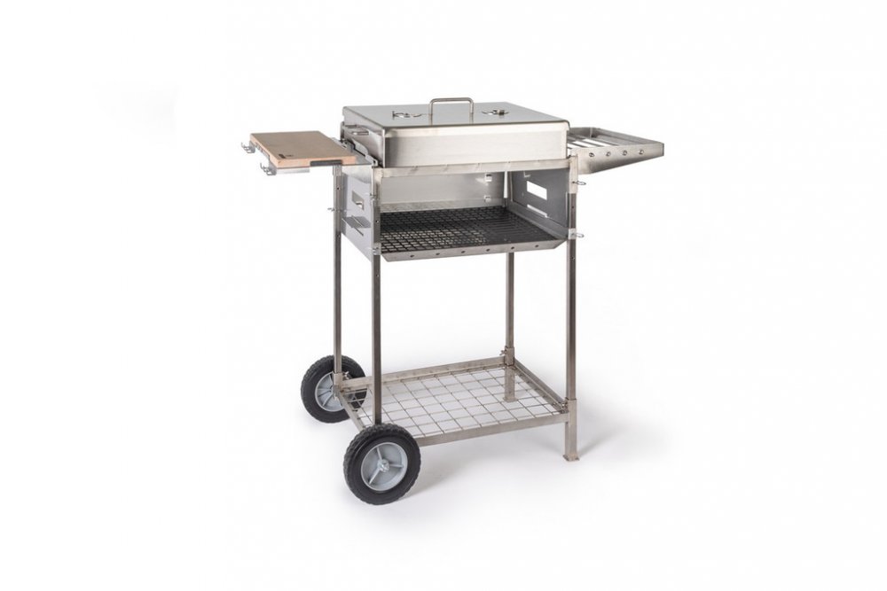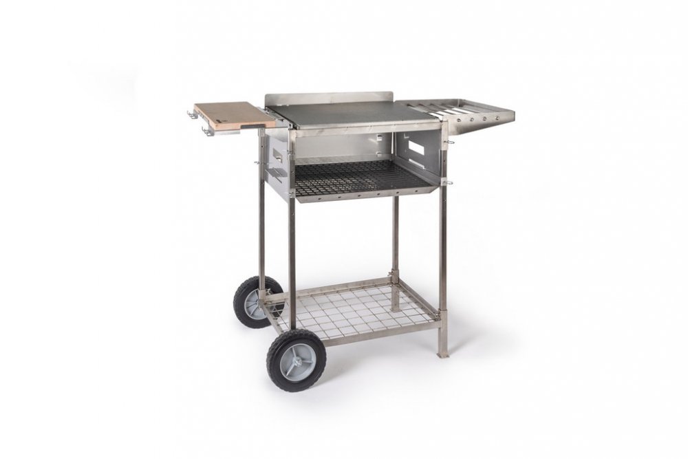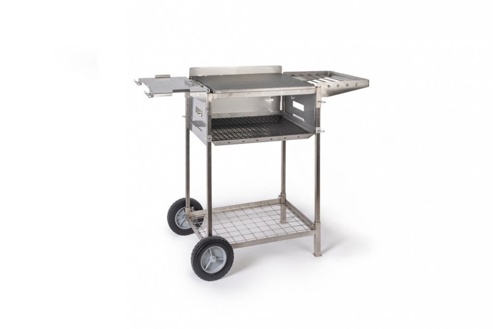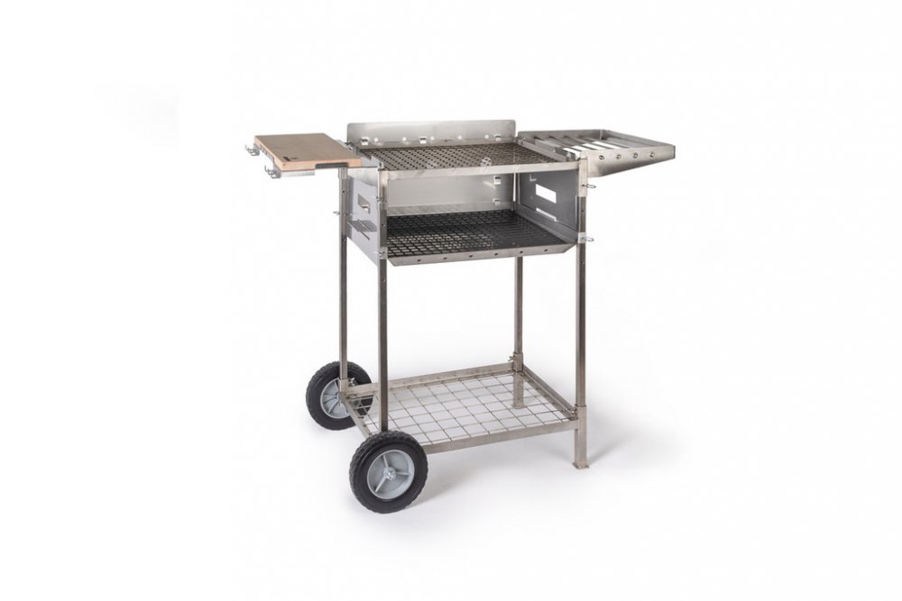 Sestava dále zahrnuje nerezový podvozek se dvěma bytelnými koly o průměru 20 cm, takže se s grilem můžete odvážit i do složitějšího terénu beze strachu z toho že se vám kola někde zadrhnou. Spodek podvozku je vyplněn drátěnou mřížkou, čímž je vytvořen úložny prostor pro palivo nebo jiné objemnější věci. Gril se jednoduše postaví do průvlaků v podvozku a nohy se zajistí křídlatými šrouby. Celý gril je díky podvozku pevnější a stabilnější a grilovací plocha se zvýší na výšku 85 cm, což představuje naprostý komfort a grilování bez ohýbání zad.