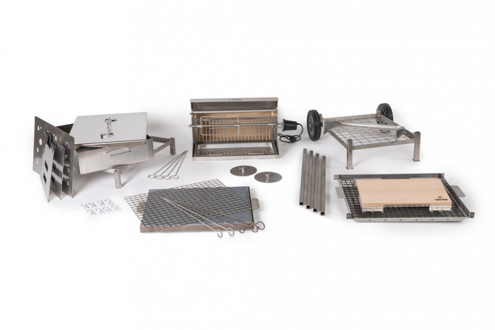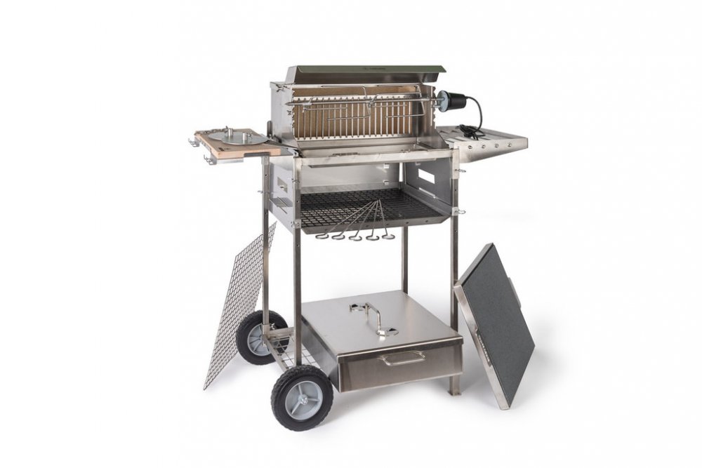 Pojízdný skládací nerezový zahradní gril s úložným prostorem, spodním a zadním topeništěm a dvěma odkládacími plochami nabízí 5 způsobů grilování na jednom grilu: lávový kámen z Itálie, nerezovou grilovací mřížku, špízové jehly, gril na 2 kuřata / kýtu a nerezovou lornu