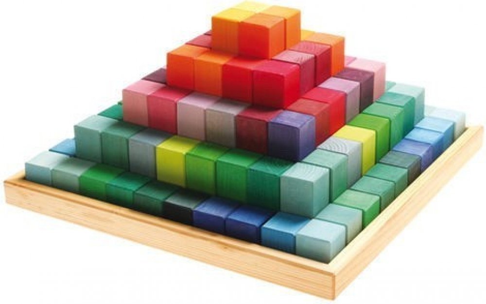 Stavebnice poschoďová pyramida je velká a obsáhlá stavebnice, která zahrnuje 100 kostek o síle 4 cm v různých výškách. Nejnižší kostky mají výšku 4 cm a nejvyšší 20 cm. Díky tomu vystaví děti z kostek úžasné, členité a vysoké stavby. Kostky září spoustou barviček, které děti doslova lákají ke stavění, kombinování a experimentování s tvary i barevnými vjemy.