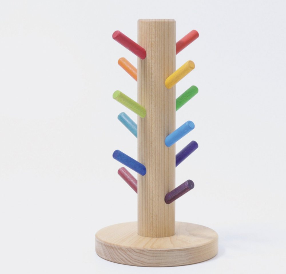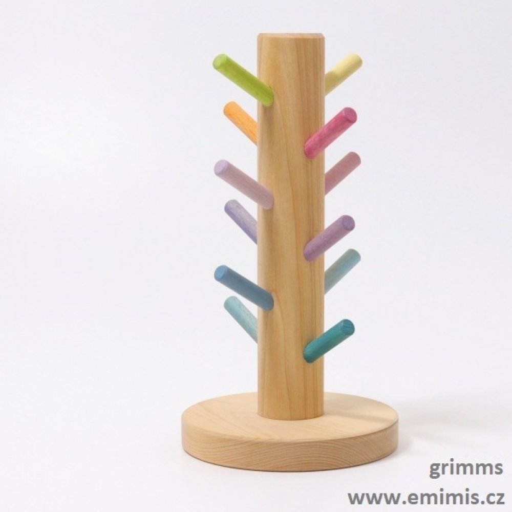 Zábavná hra na třídění s 12 duhovými hmoždinkami. Perfektní úložiště pro 24 Grimms barevných stavebních kroužků (10164).