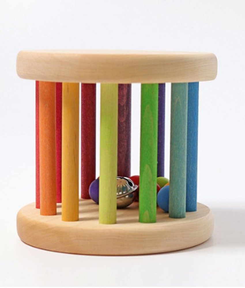 Toto robustní barevné kolečko inspiruje děti, aby se po něm plazily a chodily: dřevěné korálky a zvonek uvnitř vydávají zvuk a barvy gradují jako barvy duhy při válení. Kolečko s dřevěnými korálky a zvonkem.