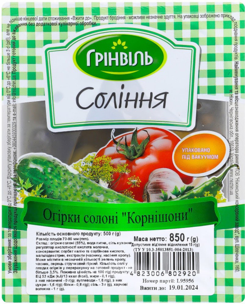 Složení: nakládané okurky (55 %), pitná voda, jedlá sůl, regulátor kyselosti: kyselina mléčná, konzervanty: sorban draselný a sorbová kyselina, maltodextrin