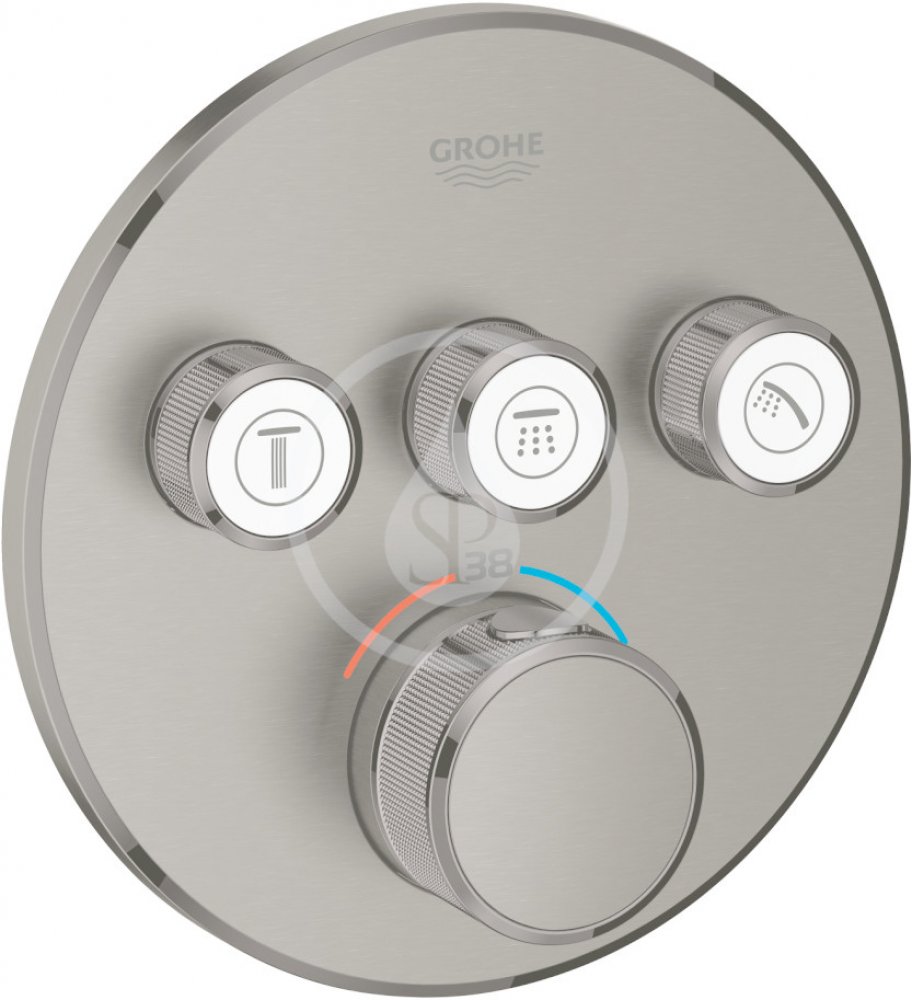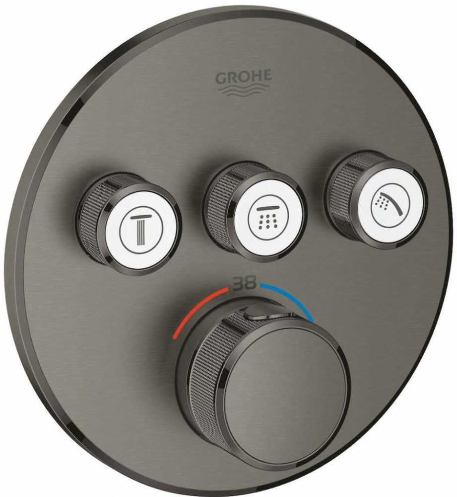 V jednoduchosti je síla. Za touto jednoduchostí obvykle stojí propracovaný systém, který uživatelské pohodlí umožní. A přesně v tomto duchu je konstruována termostatická sprchová baterie pod omítku GROHE Grohtherm SmartControl. Jedná se o funkčně i esteticky příjemný koupelnový prvek, který do vaší koupelny přinese bezpečnost a styl. Na první pohled zaujme působivou povrchovou úpravou kartáčovaný Hard Graphite. Povrchy jsou ošetřeny technologií GROHE StarLight , která jim dodává nejen odolnost proti oděru, ale také pomáhá odolat usazování vodních kapek a nečistot. Teplotu proudu nastavujete prostřednictvím otočné rukojeti, přičemž u teplot přesahujících 38 °C je třeba uvolnit bezpečnostní zarážku GROHE SafeStop, respektive u teplot nad 43 °C pojistku GROHE SafeStop Plus. Riziko opaření je tak minimální. Výhodou jsou jasné symboly na tlačítkách. Zmáčknutím tlačítka GROHE SmartControl označeným příslušným spotřebičem spustíte/vypnete vodu. Intenzitu proudu regulujete jeho otočením. Vybrat můžete ekologický proud EcoJoy anebo využít plný proud Full Flow. O stálost nastavených hodnot dbá technologie GROHE TurboStat . Symboly jsou vyměnitelné. Výhodou je, že spotřebiče mohou být spuštěny současně. Pro plnou instalaci je třeba pořídit ještě montážní těleso pod omítku GROHE Rapido SmartBox.Sprchová termostatická baterie pod omítku bez tělesa3 ventilyGROHE QuickFix krytá kovová rozeta s těsněním, skryté připevnění, nastavitelná ±6°GROHE StarLight povrchGROHE SmartControl tlačítko ON-OFF, ovládání proudu od EcoJoy do plného proudu Full Flowvyměnitelné symbolykompaktní kartuše s termoprvkemGROHE SafeStop bezpečnostní zarážka při 38°CGROHE SafeStop Plus volitelný omezovač teploty při 43°Cintegrované zpětné klapky a sítko na nečistotyvýstupy mohou být spuštěny současněprůtok: výstup A = 23 l/min, výstup B = 27 l/min, výstup C = 23 l/minmontáž na montážní těleso GROHE Rapido SmartBox (není součástí dodávky)