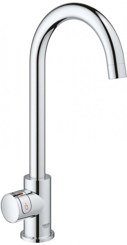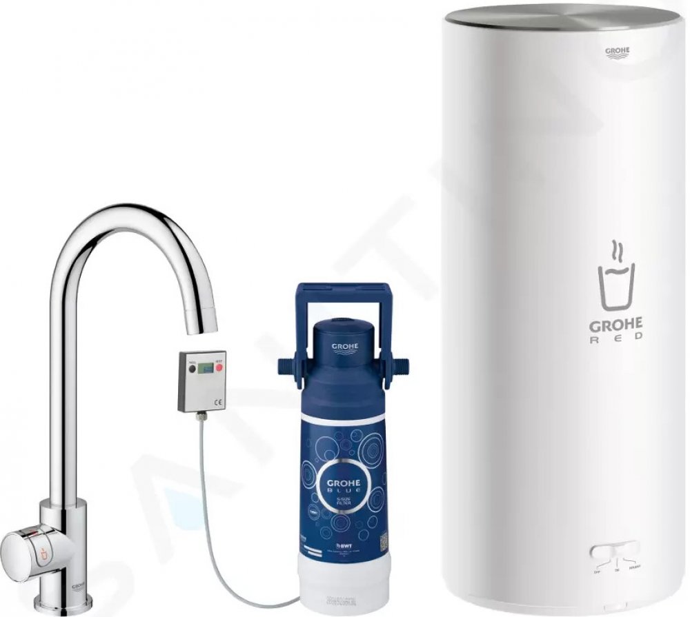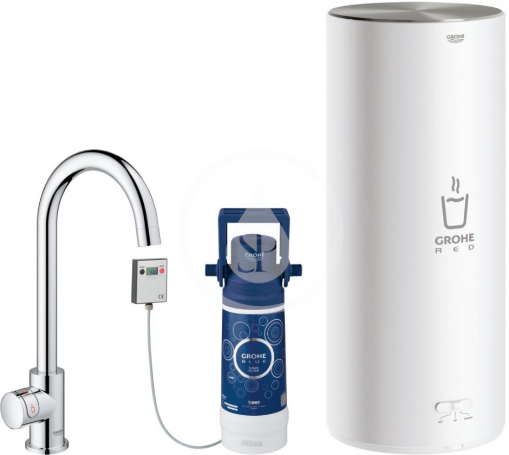 Kuchyňská baterie GROHE RED Mono (výpusť ve tvaru písmene C) s filtrační sadou a bojlerem velikosti L pro okamžitou vařící vodu. Chromový povrch.