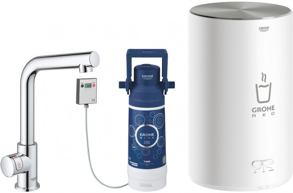 Stojánková baterie GROHE Red Mono představuje revoluci v kuchyni. Poskytne vám vařící vodu přímo z kohoutku a tím uvolní cenné místo na kuchyňské lince a urychlí vaření. Elegantní a jednoduchá baterie je určena pro separátní montáž vedle vaší stávající baterie GROHE Blue nebo jakékoliv jiné, standardní kuchyňské baterie. Vařící voda je samozřejmě vhodná na přípravu čaje nebo kávy, ale také na plnění hrnců a přípravu pokrmů. Funkci dávkování vařící vody spustíte prostřednictvím dotykových tlačítek s dětskou pojistkou. Vysoká výpusť ve tvaru písmene L usnadňuje plnění vysokých hrnců, zatímco nastavitelný rozsah otáčení (0°/150°/360°) rozšiřuje její flexibilitu. Bezpečnost je u tohoto systému naprostou prioritou – součástí baterie je automatická funkce GROHE ChildLock, dětský zámek zabraňující nechtěnému spuštění vařící vody, a technologie GROHE CoolTouch, který zaručuje, že povrch výpusti nebude nikdy zcela horký k dotyku. Bojler se pyšní třídou energetické efektivity A a lze ho přepnout do prázdninového režimu, ve kterém je teplota vody omezena na 60 °C. V normálním režimu dokáže režim poskytnout najednou až 3 litry vařící vody. Bojler je vyrobený z titanu, což mu dodává vynikající odolnost vůči korozi. Baterie disponuje povrchovou úpravou GROHE StarLight, díky které zůstane zářivá po celou dlouhou dobu životnosti. Filtr GROHE Red zároveň snižuje podíl vápníku a těžkých kovů ve vodě, což prodlužuje životnost jako vodovodní baterie, tak bojleru. Pokud je vaše kuchyň zásobená průtokovým ohřívačem vody, zvažte pořízení směšovacího ventilu Coldfill (40841001) jakožto náhradu za vaši stávající baterii, který míchá studenou vodu z rozvodné sítě s vařící vodou ze systému GROHE Red. Budete tak mít k dispozici smíšenou vodu s nižší spotřebou a bez čekání.