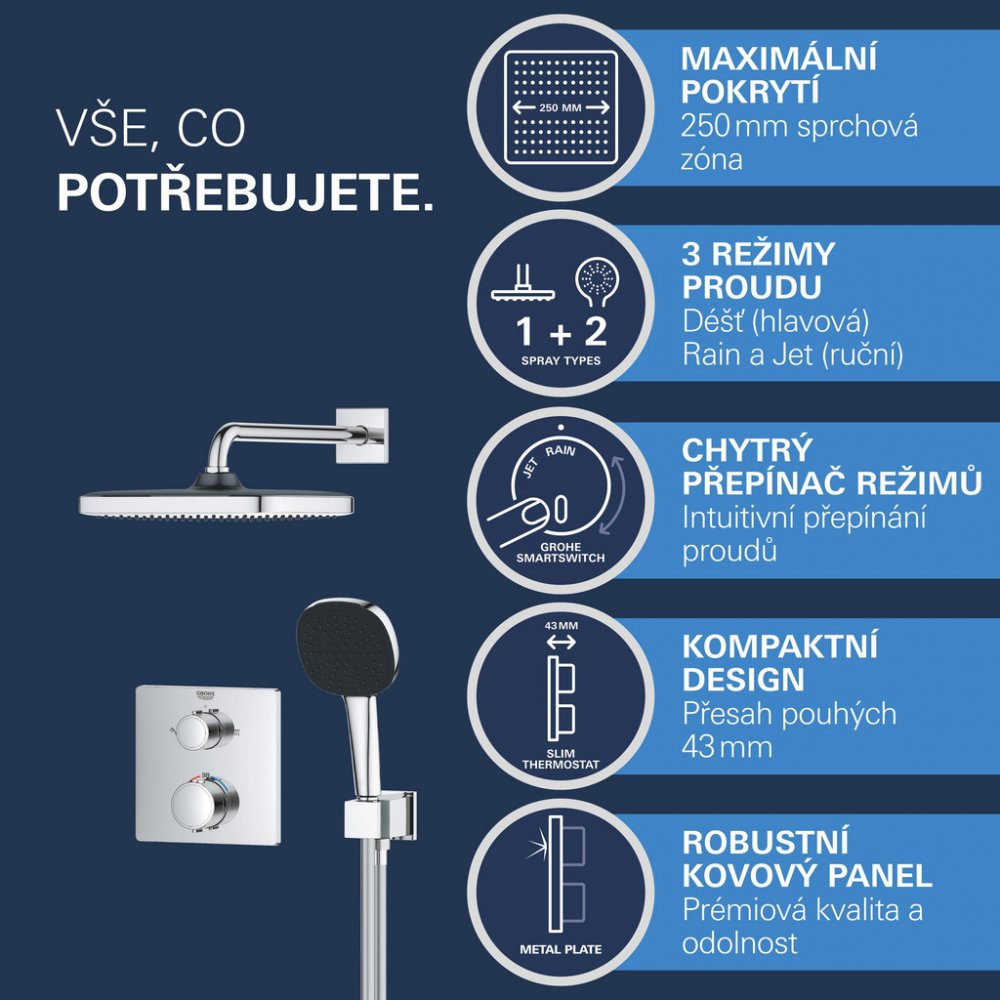volitelný systém GROHE SafeStop Plus - umožňuje přidat další limit 43 °C pro vyšší úroveň bezpečnosti