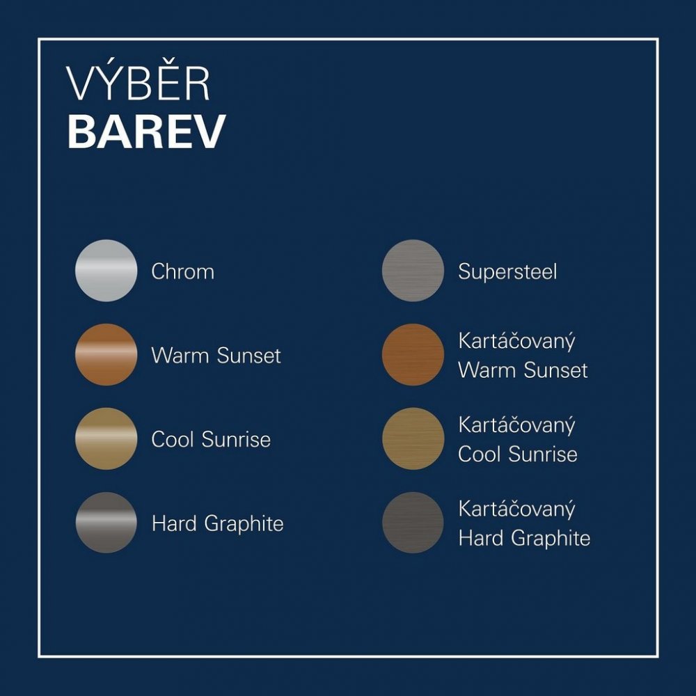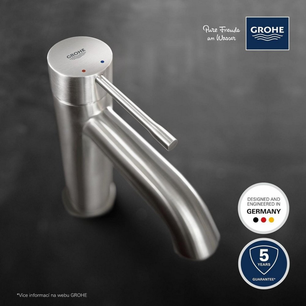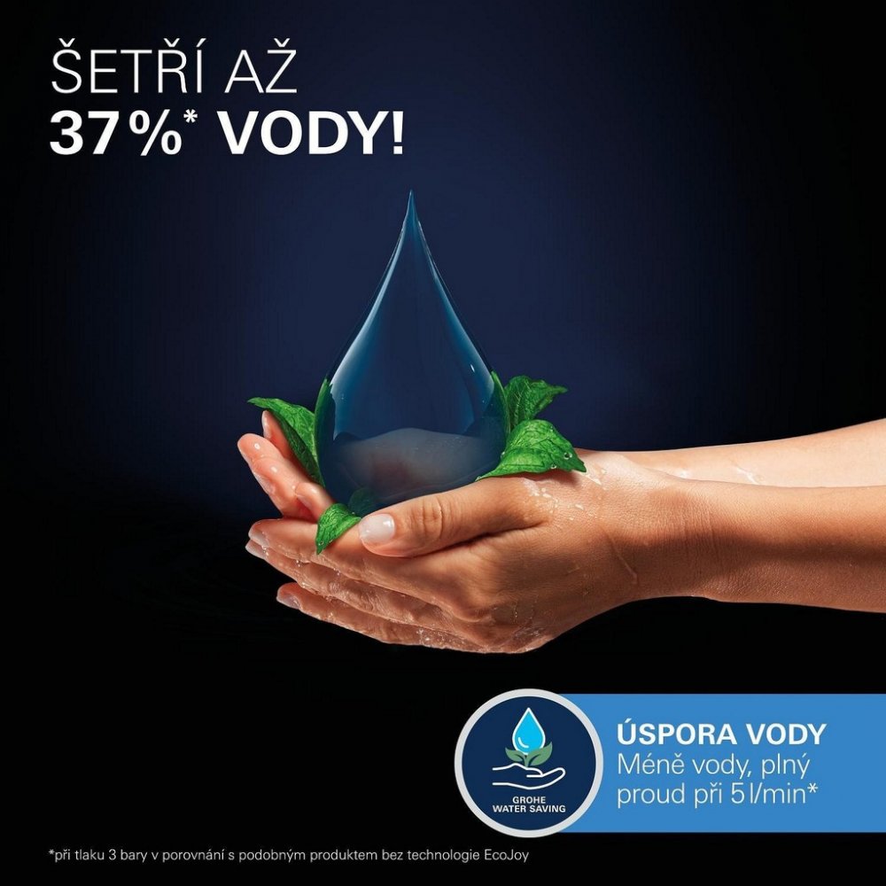 jednootvorová montážkovová pákaGROHE SilkMove® keramická kartuše 28 mms omezovačem teplotyGROHE StarLight povrchGROHE EcoJoy perlátor 5,7 l/minGROHE AquaGuide nastavitelný perlátorGROHE QuickFix Plus rychloupevňovací systémflexi připojovací hadičky