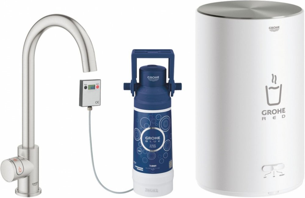 - Směšovací baterie Grohe Red Mono- jednootvorová armatura- c-výtok- Grohe ChildLock tlačítko pro spuštění vaření vody- certifikát TÜV, elektronická trojnásobná ochrana proti náhodnému spuštění- izolační trubka- rozsah otáčení 150°- připojení k bojleru GROHE Red- Bojler GROHE Red ve velikosti M- průtokový ohřívač teplé vody- 3 litry vroucí vody 100° C- celkový objem 4 litry- požadovaný tlak 1-7 barů- s flexibilním připojovacím potrubím a vývodem pro vařící vodu- označení CE- napájecí napětí 230 V 50 Hz- příkon 2100 W- spotřeba energie v klidu 15 W- energetická třída A- červený filtr Grohe na ochranu kotle před usazováním vodního kamene- objem 600 l při 15° dKH- 5fázový filtr- jednotka pro měření průtoku- barva: nerezová ocel