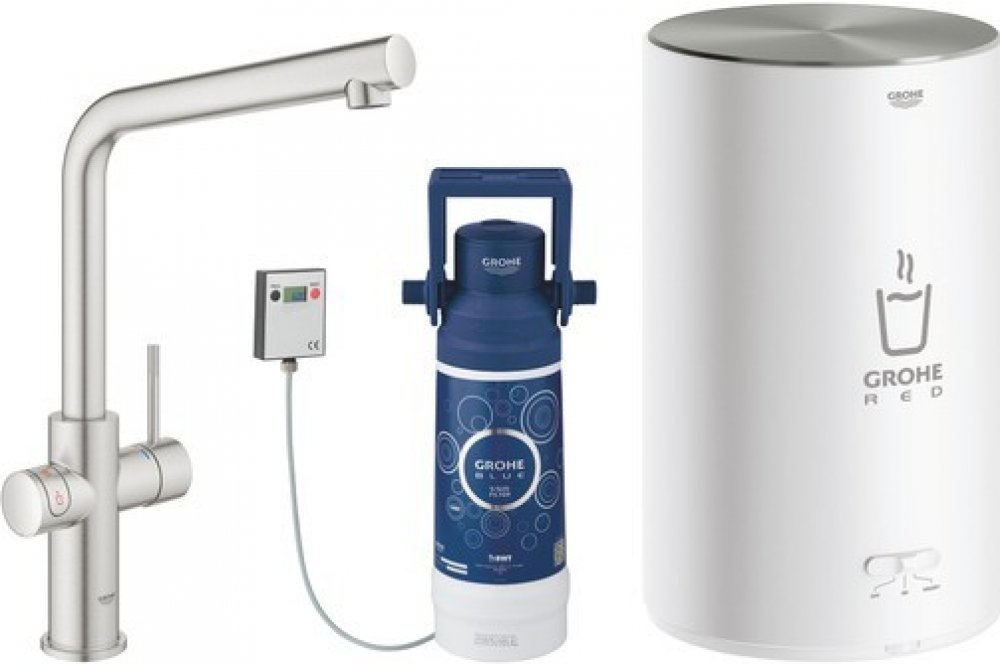 Kuchyňská baterie GROHE RED Duo (výpusť ve tvaru písmene L) s filtrační sadou a bojlerem velikosti M pro okamžitou vařící vodu. Matný povrch z nerezové oceli.