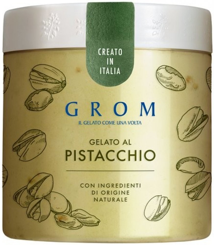 -- Odrůdy pistácií, které Grom používá, Mawardi a Perfect Green pocházejí ze středního východu. První zmínky o pistáciích pocházejí ze starověku právě z této oblasti země. Používá jen ty nejlépe vypěstované pistácie, jenž vždy vybírají sami. Byli taky první, kdo začal pro výrobu gelata používat nedobarvené pistácie.