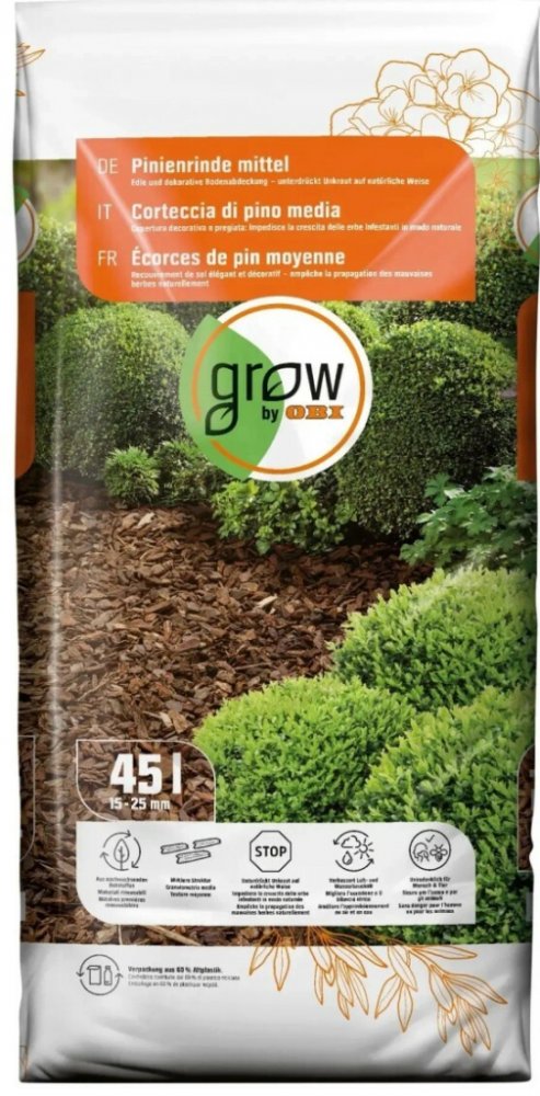 Piniová kůra GROW by OBI Piniová kůra GROW by OBI se střední zrnitostí je dekorativní krycí materiál pro pěstební plochy, zahradní úpravy, cesty a záhony. Kůra potlačuje růst plevele a zajišťuje nízkou ztrátu vlhkosti pěstebního substrátu pod ní. Chrání před vysycháním a růstem plevele Tato kůra je vysoce kvalitní povrchová vrstva, která v sobě spojuje různé pozitivní vlastnosti. S frakcí 15 až 25 mm je v péči o zahradu všestranně využitelná. Mulč zajišťuje dobré provzdušnění půdy, brání růstu plevele a působí jako přírodní humus. Kromě toho půda nevysychá tak rychle a zůstává déle vlhká. Dochází ke zmírnění teplotních výkyvů i eroze a díky schopnosti akumulovat teplo jsou citlivé rostliny chráněny před mrazem. Piniová kůra se střední zrnitostí tlí pomalu, čímž kontinuálně vzniká hodnotný humus, který následně podporuje půdní aktivitu a růst rostlin. Doporučená aplikace Před nanesením kůry byste měli půdu zkypřit a zbavit plevele. Pro efektivní mulčování rozprostřete kůru rovnoměrně ve vrstvě 4 až 8 cm. Mulč neaplikujte bezprostředně k mladým nebo nezdřevnatělým rostlinám, jinak může dojít k poškození jejich listů. Pomalým rozkladem kůry vzniká cenný kůrový humus, který dlouhodobě přispívá ke zlepšení humózní bilance v půdě. Fóliový obal z cca 60 % z recyklovaného plastu Tento obal se skládá z cca 60 % z recyklovaných plastů ze žlutých kontejnerů. Využíváme post-spotřební materiál k optimalizaci našich obalů podle aktuálního stavu techniky. Prosím, pomozte nám a odevzdejte prázdný pytel opět do tříděného odpadu (žlutý kontejner). TIP: Zahradní cesty - vrstva mulče o tloušťce 8 cm až 10 cm zajistí příjemně měkký, suchý a pružný pocit při chůzi. Urychlení kompostování - pomocí kůry můžete urychlit proces tlení ve vašem kompostu. Přimíchejte až 20 % kůry do silně zhutněného zahradního odpadu (jako je listí nebo posekaná tráva), abyste zlepšili provzdušnění a urychlili rozklad.
