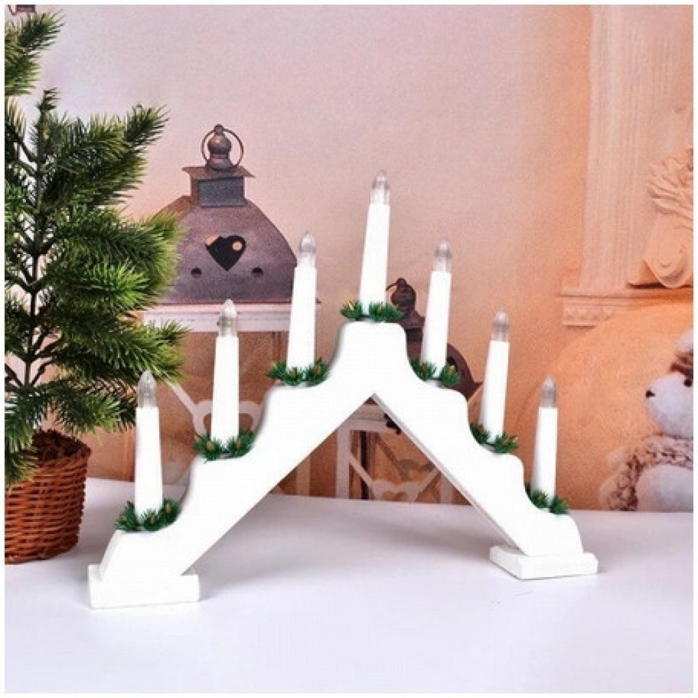 Vánoční svícen je krásná dekorace, která se hodí do každé domácnosti a navodí nádhernou atmosféru. Nízká spotřeba a dlouhá životnost. 7 ramen s LED diody. Celková výška: 29 cm. Celková šířka: 39,5 cm. Materiál: dřevo + plast. Napájení: 2 x AA 1,5V baterie.